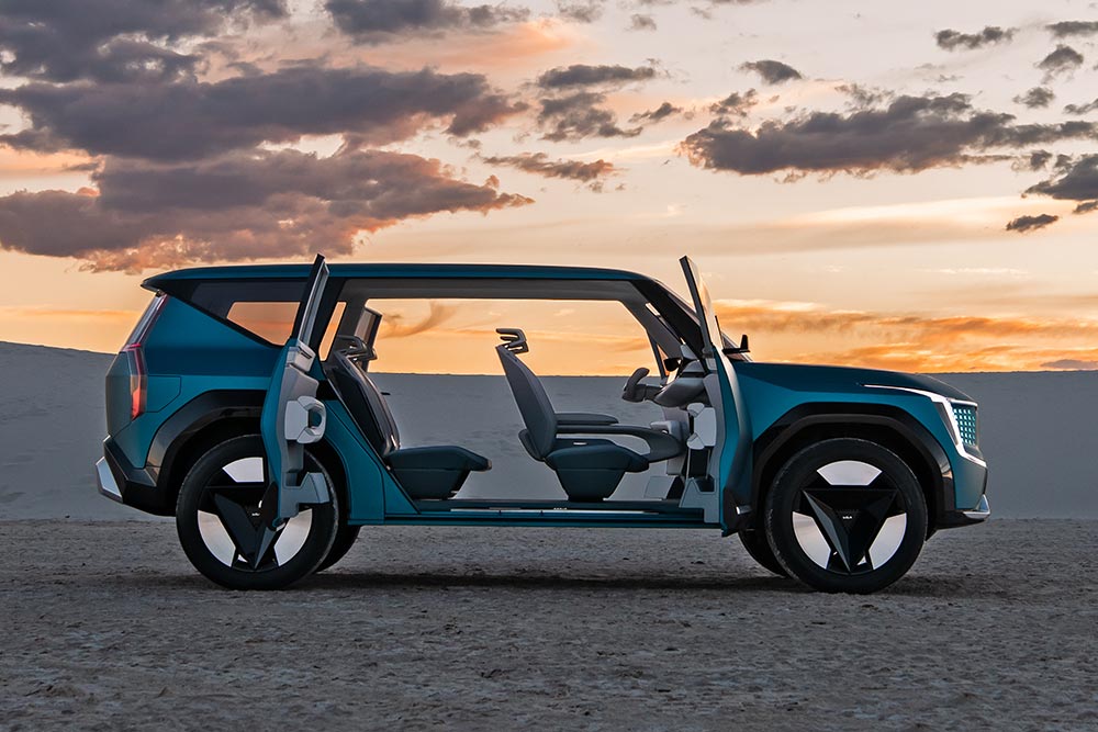 Το ίδιο μοτίβο συνεχίζει πίσω, όπου συναντάμε ανάλογη διαμόρφωση στους θόλους των τροχών και κάθετα τοποθετημένα LED φωτιστικά σώματα, που ακολουθούν το σχήμα του αμαξώματος. Σύμφωνα με τους Κορεάτες η σχεδίαση του EV9 ενσωματώνει στοιχεία περιπέτειας, εξωστρέφειας και δυναμισμού, κατάλληλα προσαρμοσμένα στη φιλοσοφία «Opposites Unite» (τα ετερώνυμα έλκονται) που διέπει όλα τα Kia. Εύφημος μνεία και ατραξιόν του EV9, οι αντίθετα ανοιγόμενες πίσω πόρτες.