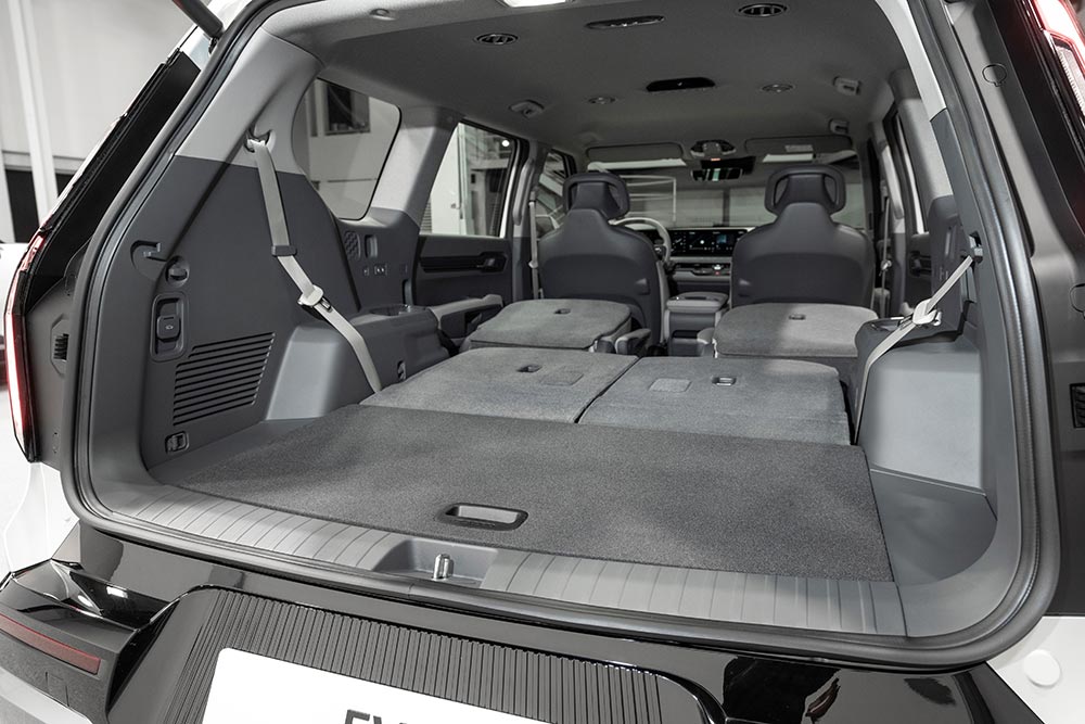 Το επταθέσιο (ένα από τα ελάχιστα ηλεκτρικά με 3 σειρές καθισμάτων) EV 9 χαρακτηρίζεται από το ευρύχωρο εσωτερικό με μινιμαλιστική και πρακτική διάταξη. Η μοναδική αρχιτεκτονική του ηλεκτρικού αυτοκινήτου, με το μεγάλο μεταξόνιο και το επίπεδο δάπεδο της πλατφόρμας E-GMP, εξασφαλίζει περισσότερο χώρο στο εσωτερικό από ποτέ άλλοτε. Εκτός από το ότι είναι ιδιαίτερα ευρύχωρο για όλους τους επιβάτες, το Kia EV9 διαθέτει πρόσθετο αποθηκευτικό χώρο στο μπροστινό πορτμπαγκάζ (frunk). Η πισωκίνητη έκδοση έχει μέγιστο χώρο frunk στα 90 λίτρα, ενώ η τετρακίνητη έκδοση προσφέρει 52 λίτρα. Το μεγάλο πίσω πορτμπαγκάζ φτάνει τα 728 λίτρα όταν τα 4/5 καθίσματα είναι όρθια και έως 333 λίτρα όταν τα 6/7 καθίσματα είναι στραμμένα προς τα πάνω.