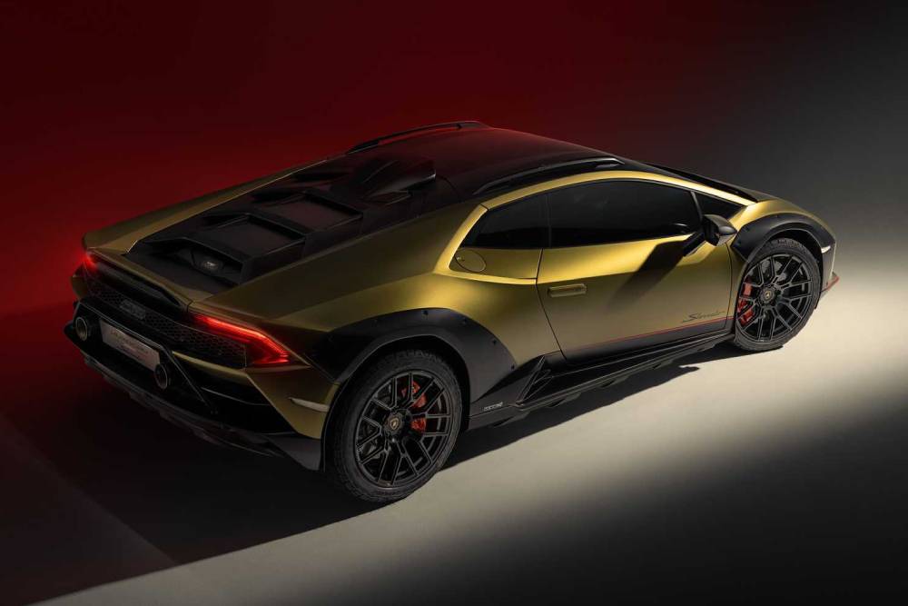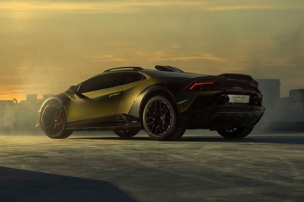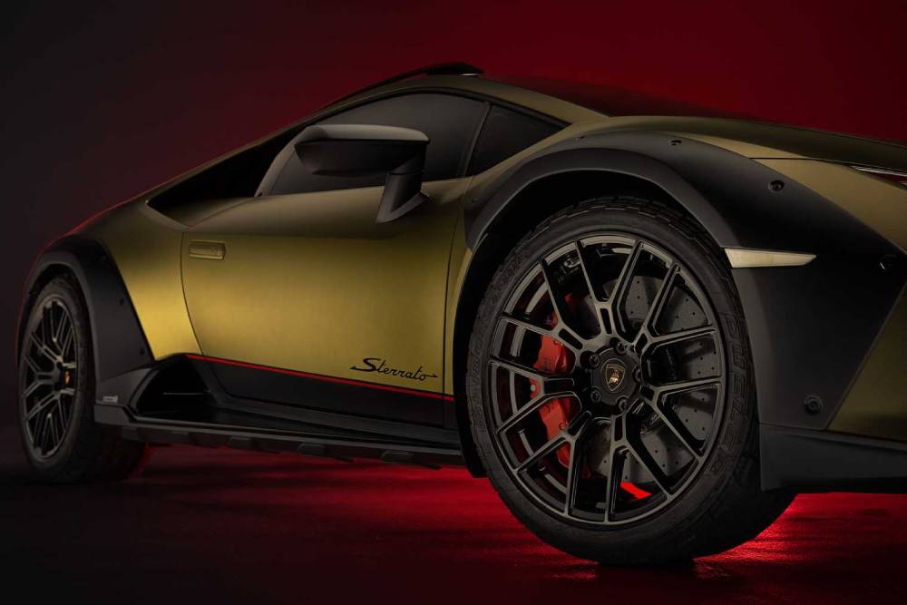 Οι νέες 19άρες ζάντες έχουν αντιχαρακτική στρώση και περιβάλλονται από μεικτά ελαστικά Bridgestone Dueler AT002, ειδικά σχεδιασμένα για τη Huracan Sterrato, κρύβοντας πίσω τους δισκόφρενα 15 ιντσών εμπρός και 14 πίσω. Ο αεραγωγός πάνω από την καμπίνα είναι πλήρως λειτουργικός και τροφοδοτεί φρέσκο αέρα το επανατοποθετημένο φιλτροκούτι, προστατεύοντάς το από τη σκόνη.