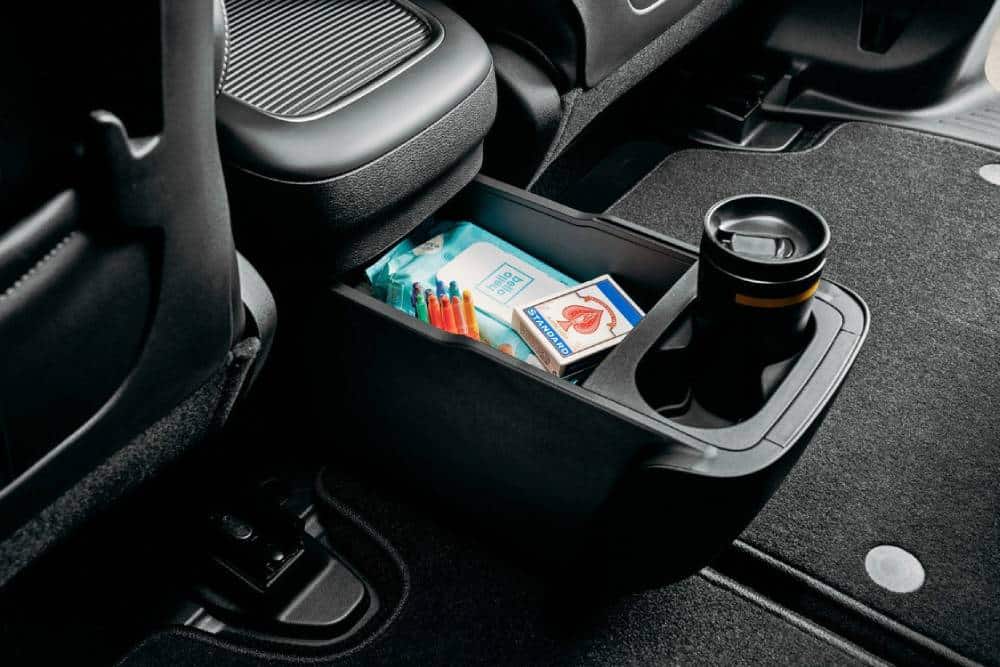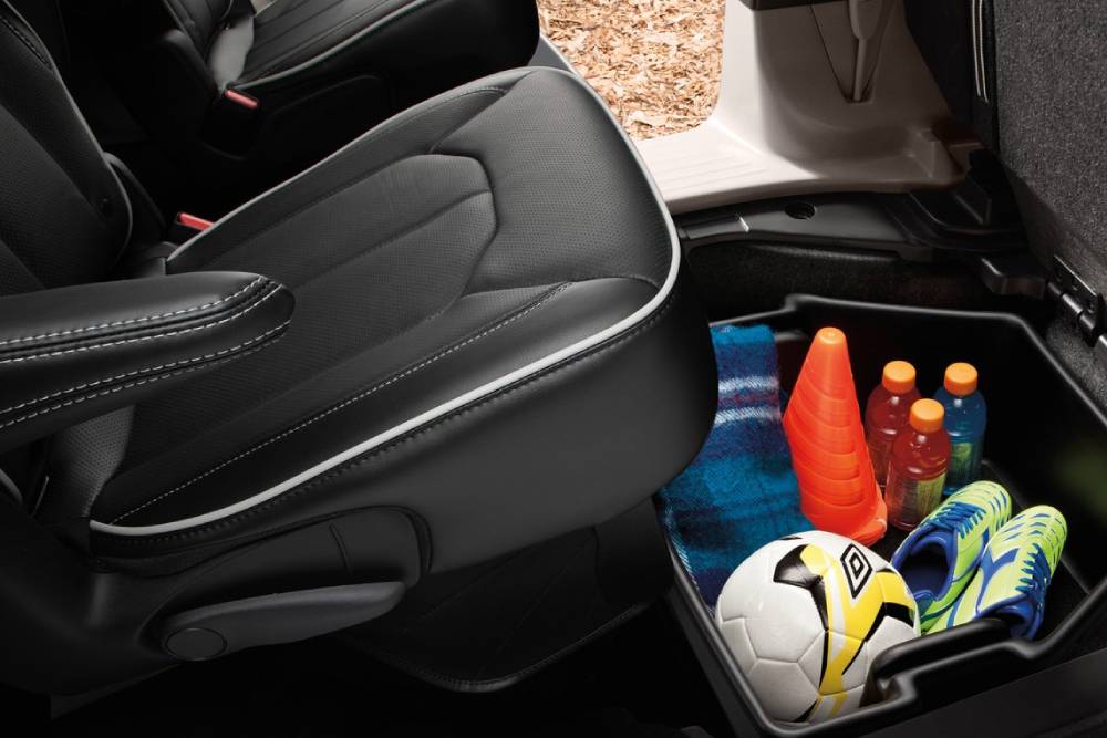Πρακτικά απαράλλαχτο παραμένει και το εσωτερικό, εξαιρώντας εκτός από το νέο σήμα στο τιμόνι. Η κορυφαία έκδοση Pinnacle διαθέτει πλέον δερμάτινη επένδυση σε μπλε απόχρωση με μπρονζέ λεπτομέρειες, ενώ ο ψηφιακός πίνακας οργάνων λάμπει δια της απουσίας του. Αναλογικό καντράν και μπόλικα φυσικά κουμπιά/διακόπτες στην καμπίνα, έχοντας μόνο την οθόνη αφής 10,1 ιντσών για το infotainment να αποπνέει ψηφιακότητα. Η λίστα του διαθέσιμου εξοπλισμού περιλαμβάνει από πανοραμική ηλιοροφή μέχρι ενσωματωμένη ηλεκτρική σκούπα (!) και το χαρακτηριστικό σύστημα Stow’n Go, το οποίο επιτρέπει την αναδίπλωση των καθισμάτων της δεύτερης και τρίτης σειράς. Σημειωτέον, το Pacifica ξεφεύγει από τη νόρμα των 7 θέσεων (2-3-2 διάταξη) και μπορεί να φιλοξενήσει μέχρι 8 επιβάτες (2-3-3).