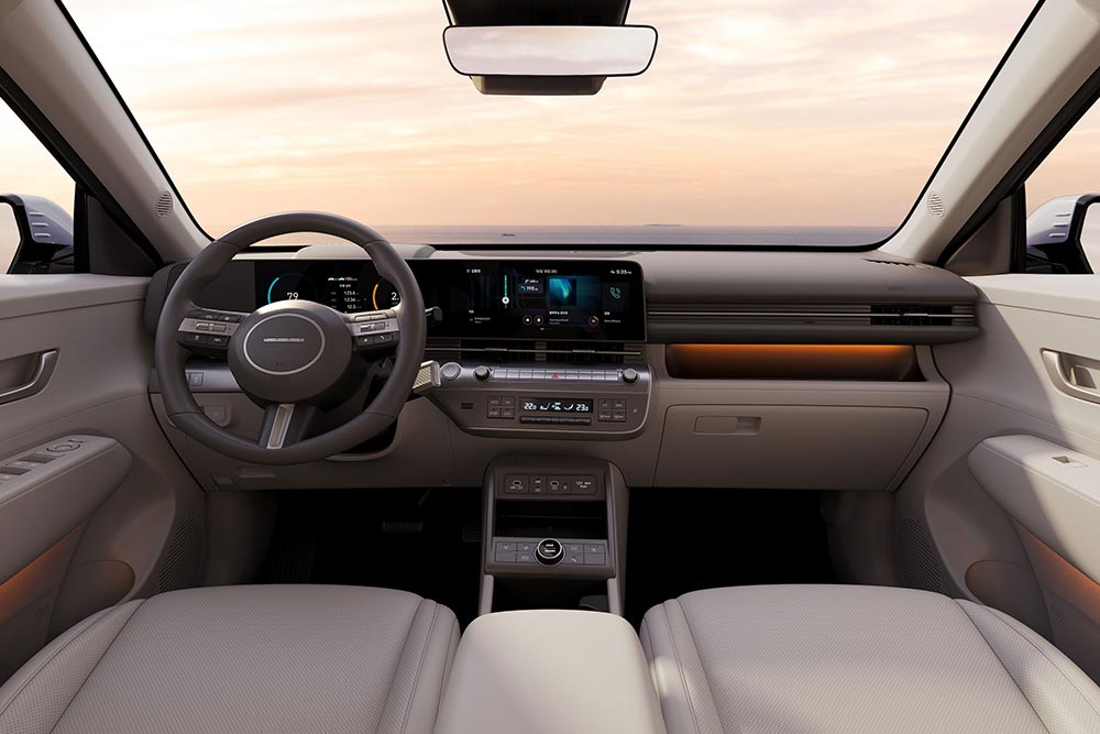 Σχεδιαστικά τώρα, το εσωτερικό του Kona δεν θυμίζει απολύτως πουθενά το σημερινό. Η δεύτερη γενιά του λαοφιλούς Hyundai ενστερνίζεται τις γραμμές του Ioniq 5 , όπως εκφράζεται από την αιωρούμενη τεχνοτροπία για το κεντρικό μέρος του ταμπλό, την ενιαία διάταξη οθονών με ένα σετ 12,3 ιντσών για τον ψηφιακό πίνακα οργάνων και το σύστημα πολυμέσων, αλλά και την περιορισμένη παρουσία διακοπτών. Η πληρότητα στα συστήματα υποβοήθησης και συνδεσιμότητας, όπως και η δυνατότητα ασύρματων (over-the-air) αναβαθμίσεων, τονίζουν την έμφαση που δίνουν οι Κορεάτες στην τεχνολογία.
