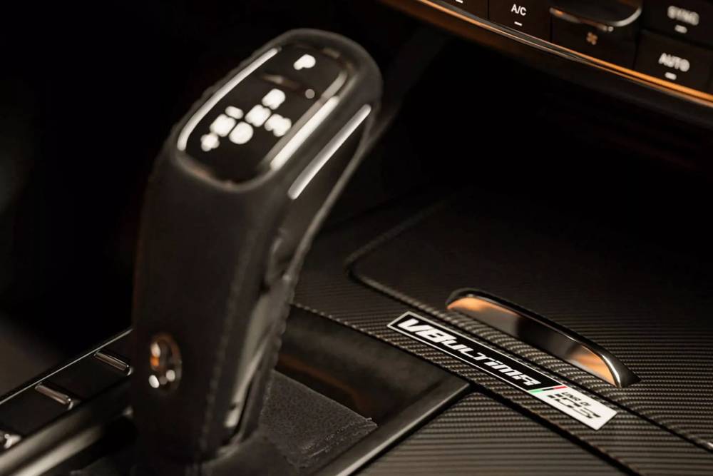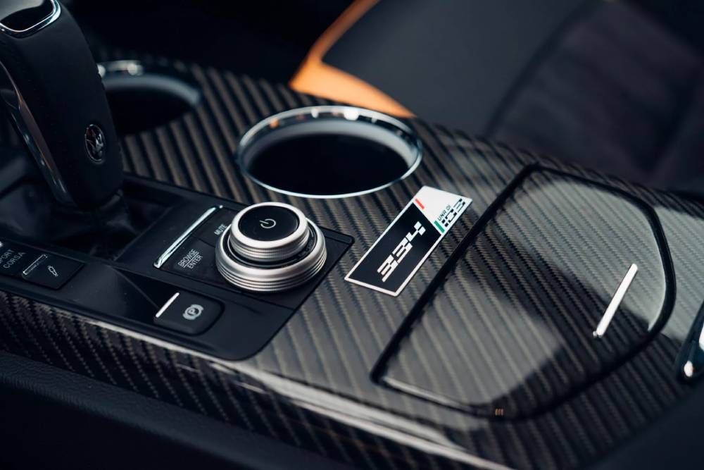 Το εσωτερικό χαρακτηρίζεται από τις δερμάτινες επενδύσεις Ultima Pale Terracotta και την alcantara στο κέντρο των καθισμάτων, ενώ παρατηρούμε το «334» στα προσκέφαλα και την πλακέτα στην κεντρική κονσόλα, μαζί με άλλη μία («Una di 103») που υποδηλώνει τον αριθμό παραγωγής.