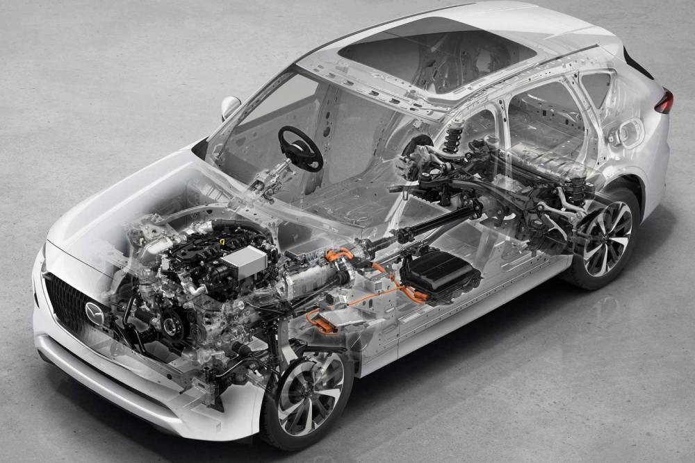 Τεχνικά χαρακτηριστικά για τον ολοκαίνουργιο βενζινοκίνητο εξακύλινδρο εν σειρά των 3.0 λίτρων, που επίσης κάνει πρεμιέρα στο μεγάλο SUV της Mazda, δεν ανακοινώνονται ακόμα. Οι Ιάπωνες, ωστόσο, αναφέρουν την κατανομή βάρους στο ντίζελ, που οριοθετείται στο 55-45 εμπρός-πίσω. Το βάρος του φτάνει τα 1.900 κιλά, την ώρα που το CX-60 PHEV ξεπερνά τους 2 τόνους κατά 50 κιλά (2.050). Παρά το επιπλέον φορτίο των 150 κιλών, η χωροταξία ηλεκτροκινητήρων-μπαταριών και το χαμηλότερο βάρος του ατμοσφαιρικού τετρακύλινδρου 2.5 SkyActiv-G μπροστά, επέτρεψαν στους μηχανικούς να δώσουν στην plug-in υβριδική έκδοση την τέλεια κατανομή μαζών: 50-50!