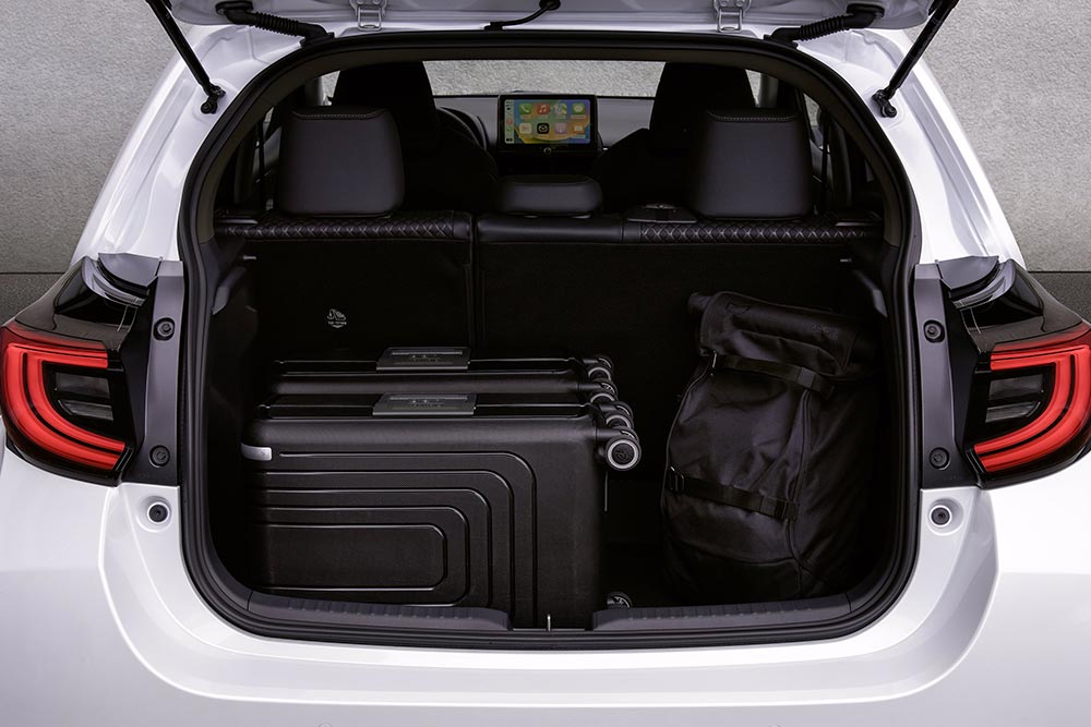 Στο εσωτερικό τη διαφορά σε σχέση με το Yaris Hybrid, την κάνουν οι οθόνες του πίνακα οργάνων και του infotainment. Συγκεκριμένα στην κορυφαία έκδοση Homura Plus φιλοξενείται ένας επίπεδος ψηφιακός πίνακας οργάνων 12,3 ιντσών και μια κεντρική οθόνη 10,5 ιντσών, μαζί με head-up display. Στο άλλο άκρο, η βασική έκδοση Prime-line εξοπλίζεται με 9 ιντσών οθόνη infotainment, με σύστημα εισόδου χωρίς κλειδί, θύρα USB-C, αυτόματο φρενάρισμα, προειδοποίηση αλλαγής λωρίδας, αναγνώριση σημάτων κυκλοφορίας, προσαρμοζόμενο cruise control κ.λπ. Το Centre-line διαθέτει ακόμα ηλεκτρικά αναδιπλούμενους καθρέπτες, ζάντες αλουμινίου 16 ιντσών, πίσω αισθητήρες παρκαρίσματος και το σύστημα ελέγχου των τυφλών γωνιών. Πιο πάνω τοποθετείται το Homura με φώτα LED εμπρός – πίσω, 17άρες ζάντες, διζωνικό κλιματισμό, ημιδερμάτινα καθίσματα και LED εσωτερικό φωτισμό.