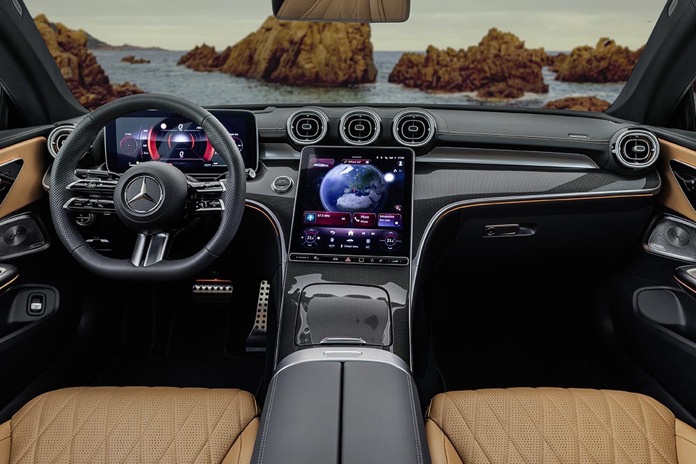 Το εσωτερικό προέρχεται αυτούσιο από της νέας C-Class. Τα βλέμματα συγκεντρώνουν αμέσως η οθόνη των 12,3 ιντσών του πίνακα οργάνων και η οθόνη των 11,9 ιντσών του infotainment. Μια νέα, ειδική λειτουργία EASY-ENTRY εξασφαλίζει εύκολη πρόσβαση στο πίσω μέρος. Τα μπροστινά καθίσματα δεν ξεκλειδώνονται με μοχλό, αλλά με κομψή θηλιά από δέρμα Nappa. Φυσικά η πολυτέλεια είναι υψηλού επιπέδου, σε ολόκληρο το θάλαμο των επιβατών. Οι μεγαλύτερες διαστάσεις από την C-Class Coupe ωφέλησαν παράλληλα τόσο τους χώρους για τους επιβάτες, όσο και για τις αποσκευές (420 λίτρα).
