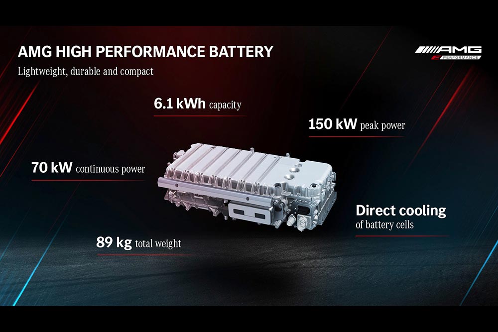 Η ενέργεια για τον ηλεκτροκινητήρα αντλείται από μια μπαταρία 6,1 kWh, η οποία ζυγίζει 89 κιλά, με την αμιγώς ηλεκτρική αυτονομία της AMG GT 63 E να ανέρχεται στα 12 χλμ. και υπάρχουν τέσσερα διαφορετικά προγράμματα ανάκτησης της ενέργειας! Ένα μεγάλο τεχνολογικό επίτευγμα είναι ο τρόπος ψύξης των 560 στοιχείων της μπαταρίας, μέσω ενός υγρού υψηλής τεχνολογίας που τα ψύξει ξεχωριστά. Για την ακρίβεια εντός της μπαταρίας υπάρχουν 14 λίτρα ψυκτικού υγρού, το οποίο ρέει συνεχώς διατηρώντας τη θερμοκρασία στο βέλτιστο επίπεδο των 45 βαθμών. Ενδιαφέρον στοιχείο είναι κι η ύπαρξη ενός συστήματος μίζας-γεννήτριας που παίρνει κίνηση από ιμάντα, έχει ισχύ 14 ίππων και τροφοδοτεί με ηλεκτρική ενέργεια όλα τα δευτερεύοντα συστήματα του αυτοκινήτου. Στη διάθεση του ο οδηγός έχει επτά διαφορετικά προγράμματα οδήγησης μέσω του AMG Dynamic Select τα οποία είναι τα εξής: Electric, Comfort, Sport, Sport+, Race, Slippery και Individual. Τα περισσότερα εξ αυτών από το όνομά τους και μόνο είναι ξεκάθαρο τι κάνουν. Όμως ενδιαφέρον έχει η λειτουργία Slippery! Όταν ο οδηγός επιλέξει αυτό το πρόγραμμα, μειώνεται η ισχύς και παρέχεται μια επίπεδη καμπύλη ροπής για να βοηθήσει την κίνηση του αυτοκινήτου σε ολισθηρές συνθήκες.
