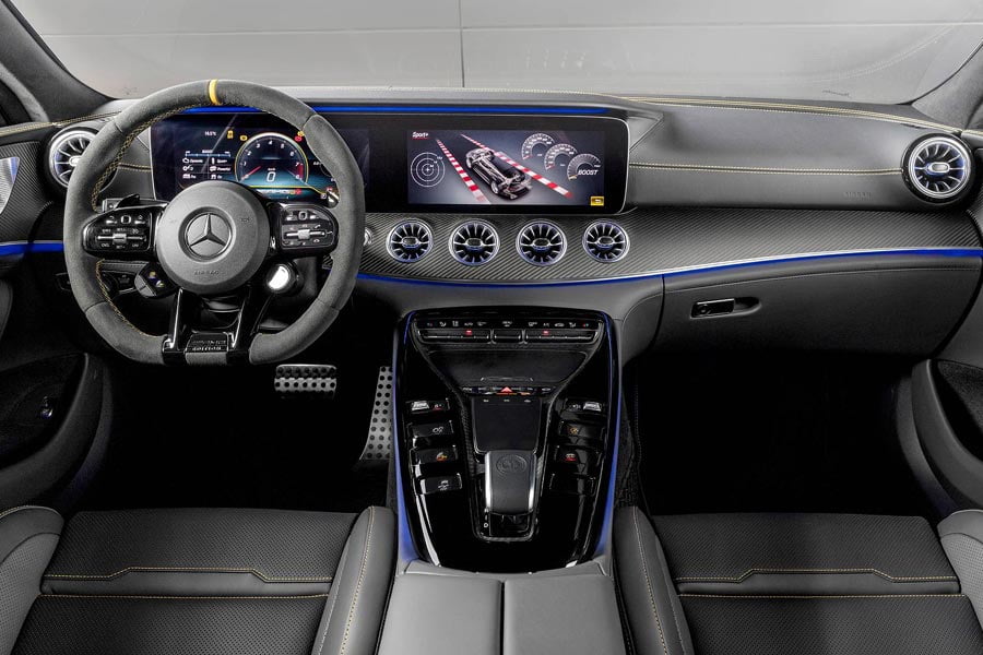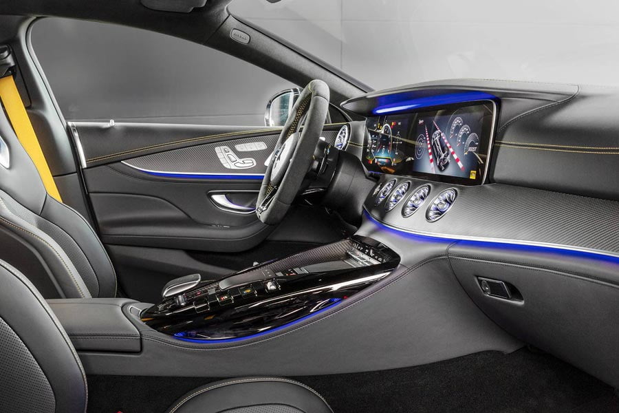 Το εσωτερικό έχει και αυτό με τη σειρά του τις απαραίτητες αλλαγές, προκειμένου να διαφοροποιηθεί από αυτό των υπόλοιπων μοντέλων. Τα καθίσματα είναι AMG Performance, με αποκλειστικό Nappa δέρμα σε διχρωμία Magma Grey και μαύρο, ενώ AMG είναι το τιμόνι και τα πατάκια, με το παζλ να ολοκληρώνεται από τις ενθέσεις ανθρακονημάτων στο ταμπλό. Όποιος το επιθυμεί μπορεί να προσθέσει στο αυτοκίνητο το AMG Night Package, το AMG Exterior Carbon-Fibre Package 2, το AMG high-performance ceramic braking system και τα High-Class πίσω καθίσματα, κάνοντάς το ακόμη πιο ξεχωριστό.