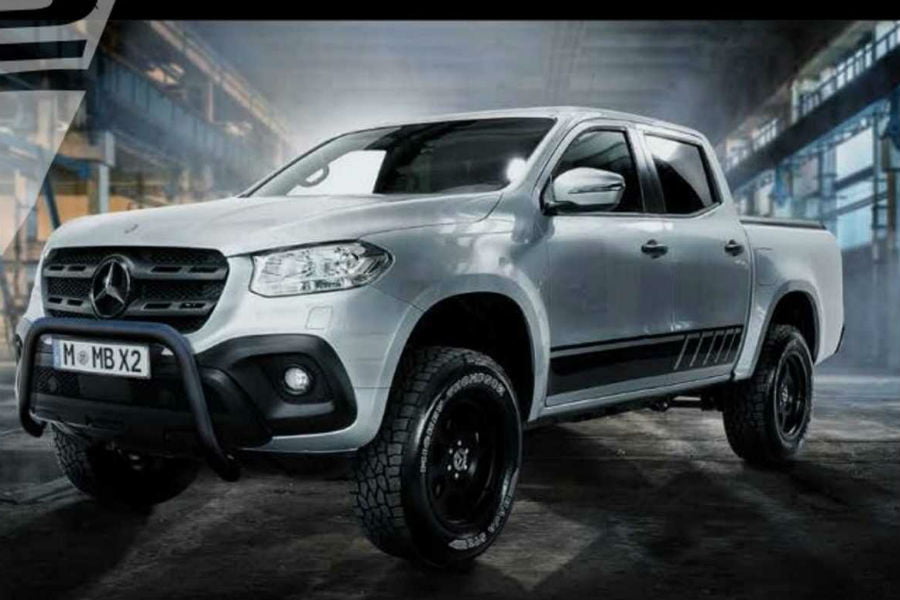 Η νέα έκδοση της X-Class διέρρευσε από τον διαμορφωτή Γερμανού αντιπροσώπου και ξεχωρίζει κατευθείαν από τις απλούστερες Χ 250 και Χ 350 d, χάρις στην αυξημένη απόσταση από το έδαφος, τους νέους τροχούς και τα αυτοκόλλητα. Ο δρόμος πλέον απέχει 30 εκατοστά από το αμάξωμα, σε σύγκριση με τα 20 και 22 που μπορεί να φτάσει κανονικά το γερμανικό pick up με την επιλογή του offroad πακέτου. Οι νέες ζάντες των 18 ιντσών είναι ντυμένες με αμιγώς χωμάτινα ελαστικά διάστασης 265/60, η σιδεριά στον εμπρός προφυλακτήρα είναι βαμμένη σε μαύρο ματ χρώμα και τα αυτοκόλλητα συμπληρώνουν ιδανικά την περιπετειώδη εμφάνιση.