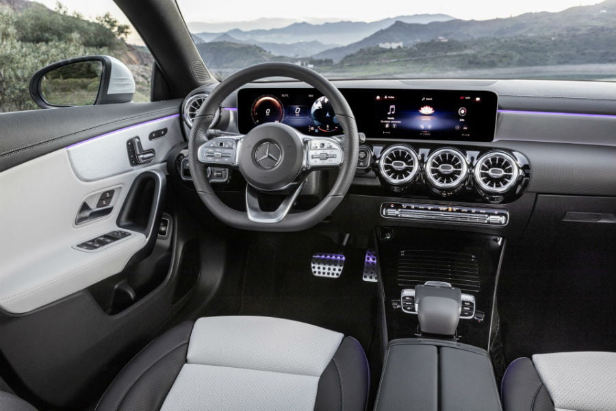 Στο εσωτερικό συναντάμε το ταμπλό της A-Class, με τις κορυφαίες εκδόσεις να εξοπλίζονται με το σύστημα πολυμέσων MBUX και την ενιαία διαμόρφωση με τις 2 οθόνες των 10,25 ιντσών στο πάνω μέρος.