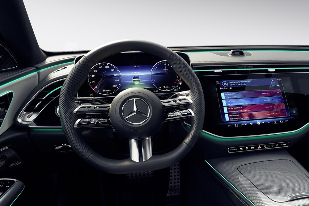 Με το νέο Active Ambient Lighting με Sound Visualisation, οι επιβάτες της νέας E-Class μπορούν να βιώσουν μουσική με τρεις αισθήσεις: ήχο με την τεχνολογία Dolby Atmos, αίσθηση από το προαιρετικό σύστημα ήχου Surround Burmester 4D και όραση, από τη φωτεινή λωρίδα του Active Ambient Lighting, όπου ανάλογα τον ήχο αλλάζει ο φωτισμός. Ο συνοδηγός έχει και αυτός μπροστά του μια οθόνη για να μην είναι… παραπονεμένος, από όπου μπορεί να παρακολουθήσει τηλεόραση, βίντεο κ.λπ.
