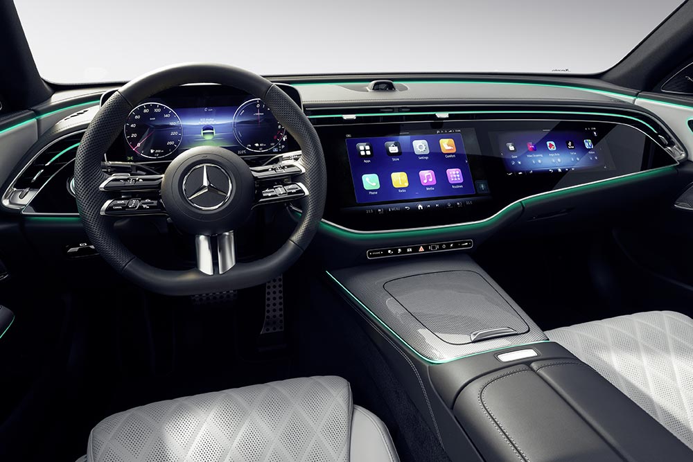 Η γερμανική φίρμα υπόσχεται μια ιδιαίτερα καθηλωτική εμπειρία ψυχαγωγίας στους μελλοντικούς πελάτες της νέας E-Class. Μουσική, παιχνίδια και streaming υπό όλες τις συνθήκες, χάρη στη νέα ηλεκτρονική αρχιτεκτονική, το νέο, πολύ ισχυρό κεντρικό ενσωματωμένο υπολογιστή και την τεχνολογία 5G. Η μεγάλη γυάλινη επιφάνεια της Superscreen MBUX εκτείνεται μέχρι την κεντρική οθόνη και ενσωματώνει άπειρες λειτουργίες.