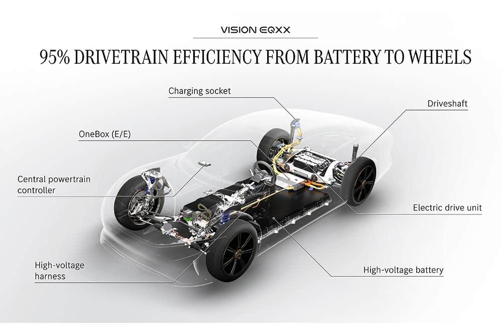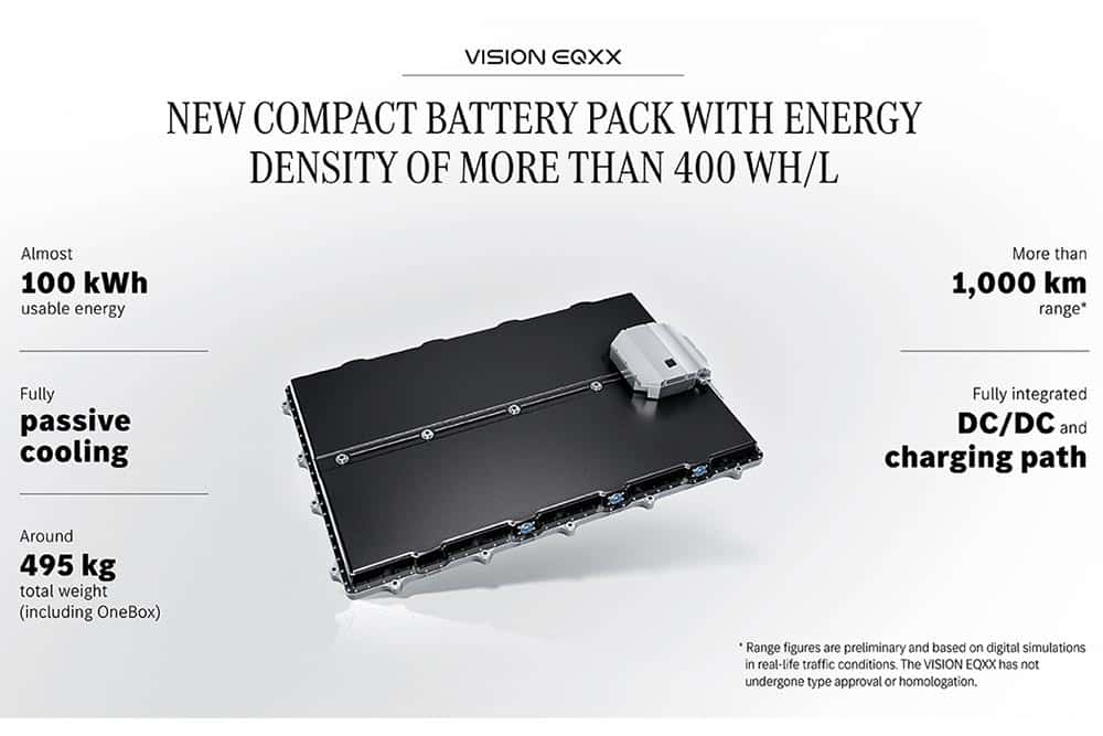Η Mercedes-Benz και η ομάδα HPP (Formula 1 ειδικοί στη Mercedes-AMG High Performance Powertrains), αντί απλώς να αυξήσουν το μέγεθος της μπαταρίας, ανέπτυξαν μια εντελώς νέα μπαταρία για το Vision EQXX, επιτυγχάνοντας αξιοσημείωτη ενεργειακή πυκνότητα κοντά στα 400 Wh/l. Η σημαντική αύξηση της ενεργειακής πυκνότητας προέρχεται εν μέρει από τη σημαντική πρόοδο στη χημεία των ανοδίων. Η υψηλότερη περιεκτικότητά τους σε πυρίτιο και η προηγμένη σύνθεσή τους σημαίνει ότι μπορούν να διατηρούν πολύ περισσότερη ενέργεια από τα κοινά χρησιμοποιούμενα ανόδια. Επίσης, η αύξηση της τάσης σε περισσότερα από 900 βολτ αποδείχθηκε εξαιρετικά χρήσιμο εργαλείο έρευνας για την ανάπτυξη των ηλεκτρονικών ισχύος.