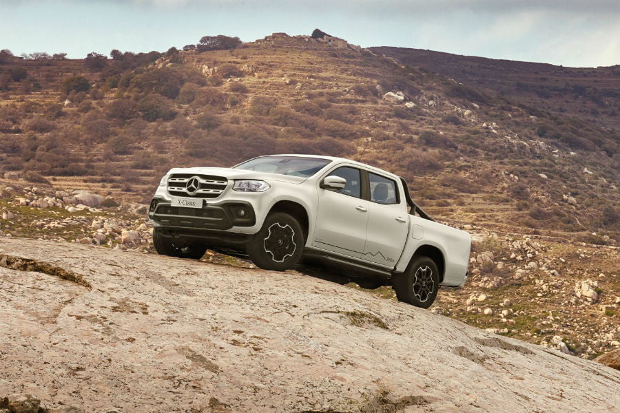 Εμφανισιακά δεν χρειάζονται περισσότερο από δυο ματιές για να αντιληφθεί κανείς πως η συγκεκριμένη X-Class είναι διαφορετική από τις άλλες: τα αυτοκόλλητα με την ονομασία στο κάτω μέρος των θυρών, τα σκαλοπάτια, οι νέες ζάντες αλουμινίου των 18 ιντσών και η μπάρα στην καρότσα από στιλβωμένο χάλυβα ξεκαθαρίζουν αμέσως την διαφορετικότητα του γερμανικού pickup. Τα χρώματα είναι τα εξής δυο: άσπρο και μαύρο. Λιτά κι απέριττα.