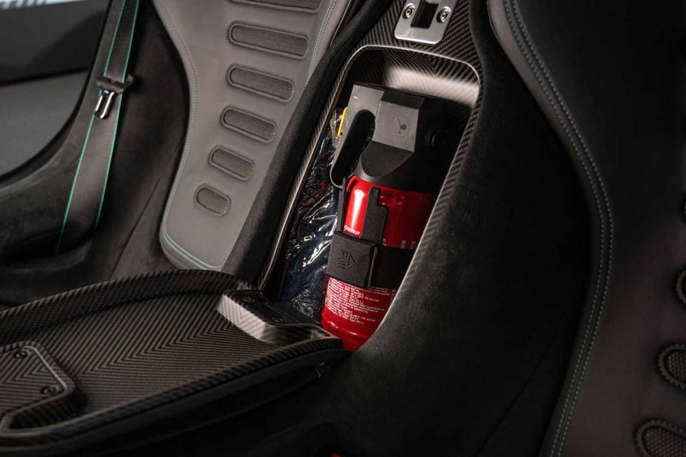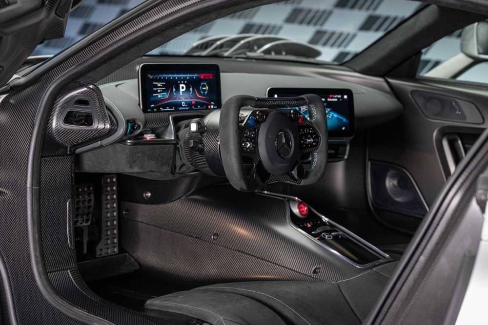 Τα ανθρακονήματα καθίσματα είναι βιδωμένα απευθείας στο επίσης carbon σασί, με τα πεντάλ και το τιμόνι να ρυθμίζονται για την προσαρμογή στα δεδομένα του εκάστοτε οδηγού. Αν το θέλει ο πελάτης, βέβαια, το κάθισμα μπορεί να ετοιμαστεί ακριβώς στα μέτρα του. To τετράγωνο και γεμάτο διακόπτες τιμόνι «φωνάζει» Formula 1, όμως το One έχει τις ανέσεις του. Υπάρχουν ηλεκτρικά παράθυρα, ηχοσύστημα και κλιματισμός, ενώ ο οδηγός μπορεί να ελέγχει τις λειτουργίες του αυτοκινήτου μέσω δυο 10ιντσων οθονών. Κεντρικό καθρέπτη πάντως δεν διαθέτει, με μια κάμερα να παίρνει τη θέση του. Κάτι που συμβαίνει λόγω της μηδενικής ορατότητας προς τα πίσω, ελέω κινητήρα και αεροδυναμικής διαμόρφωσης του αμαξώματος.