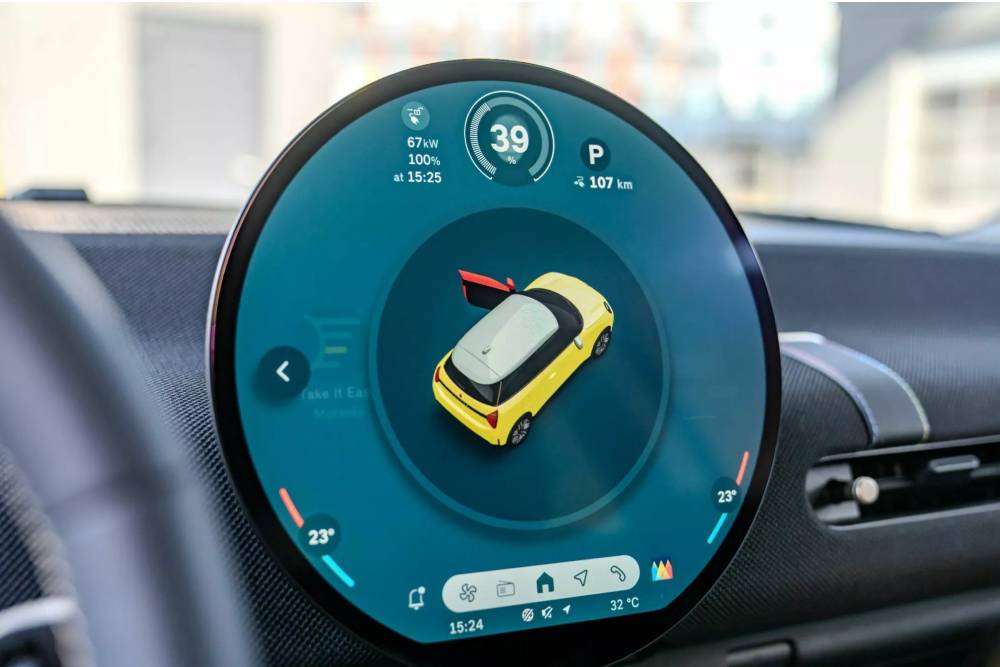 Στο εσωτερικό οι σχεδιαστές ακολούθησαν μινιμαλιστική προσέγγιση, περιορίζοντας τα πάντα στα βασικά και αφαιρώντας όσo περισσότερα στοιχεία μπορούσαν. Ως αποτέλεσμα, το ταμπλό διαθέτει τώρα μια στρογγυλή κεντρική οθόνη 9,44 ιντσών για το σύστημα πολυμέσων, το οποίο με τη σειρά του «τρέχει» το λειτουργικό Mini Operating System 9. Κάτω από την οθόνη συναντάμε κουμπιά για χειρόφρενο, επιλογέα, start/stop, ηχοσύστημα και προγραμμάτων λειτουργίας, που αλλάζουν αναλόγως τα γραφικά στο μόνιτορ. Οι αεροπορικού τύπου διακόπτες, δυστυχώς, μας αφήνουν. Το ίδιο και οι περιορισμένοι χώροι, καθώς οι Άγγλοι αναφέρουν πολύ καλή ευρυχωρία για 4 επιβάτες και πορτμπαγκάζ 200 λίτρων, που μπορεί να φτάσει έως τα 800 λίτρα (κατόπιν αναδίπλωσης του πίσω καθίσματος).