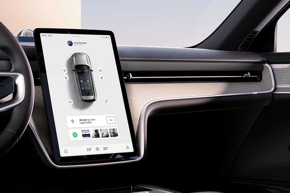 Στην επταθέσια καμπίνα συναντάμε ανακυκλωμένα και βιώσιμα υλικά, τεχνολογία και χώρους. Στο επίκεντρο βρίσκεται η οθόνη αφής των 14,5 ιντσών, που ενσωματώνει τον έλεγχο όλων των λειτουργιών. Πλοήγηση, πολυμέσα, τηλέφωνο, κλιματισμός, ακόμα και τα «αλάρμ» (κάτω δεξιά), περικλείονται στην οθόνη! Το εσωτερικό του EX90 εντυπωσιάζει με τη μινιμαλιστική προσέγγιση και την πλήρη απουσία φυσικών διακοπτών, πέρα από το περιστροφικό χειριστήριο στην κεντρική κονσόλα και τα δυο πλήκτρα στις ακτίνες του τιμονιού, επίσης αφής. Για περισσότερες πληροφορίες εστιασμένες στην οδήγηση, όπως ταχύτητα και αυτονομία, υπάρχει μια δεύτερη, μικρότερη οθόνη ακριβώς πίσω από το τιμόνι, σε ρόλο ψηφιακού πίνακα οργάνων.