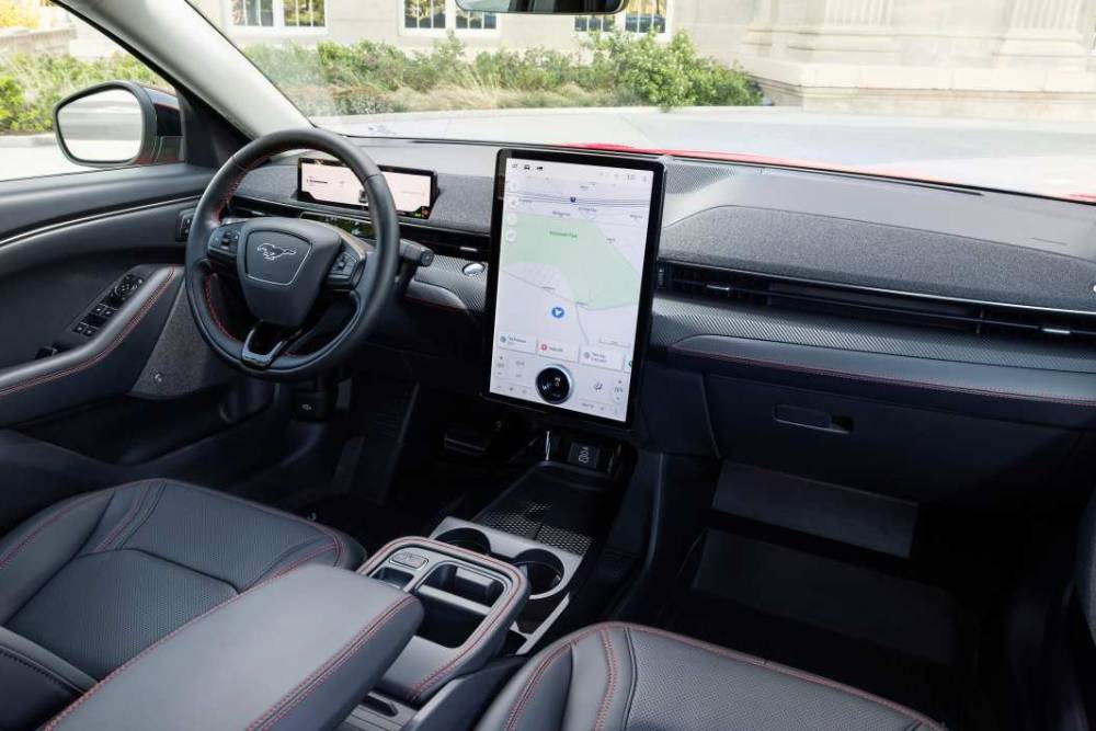 Στο εσωτερικό έχουμε μικρές διαφοροποιήσεις στις επενδύσεις και τα γραφικά στις οθόνες (10,2 ιντσών ο ψηφιακός πίνακας οργάνων, 15,5 ίντσες το infotainment), ενώ τη θέση του περιστροφικού χειριστηρίου στην κεντρική κονσόλα για το κιβώτιο, παίρνει ένας διακόπτης πίσω από τιμόνι. Επιλογή που, σύμφωνα με τη Ford, απελευθερώνει χώρο ανάμεσα σε οδηγό-συνοδηγό και αφενός αυξάνει την ευρυχωρία των δυο εμπρός επιβατών, αφετέρου εμπλουτίζει τις θήκες για τα μικροαντικείμενα. Από τεχνολογικής άποψης στάνταρ είναι τόσο η αντλία θερμότητας, όσο και το σύστημα BlueCruise 1.5 που επιτρέπει στη Mustang Mach-E να αλλάζει μόνη της λωρίδα, σε αντιστοιχία με την ταχύτητα κίνησης των άλλων οχημάτων και εκείνης στο ενεργό cruise control.