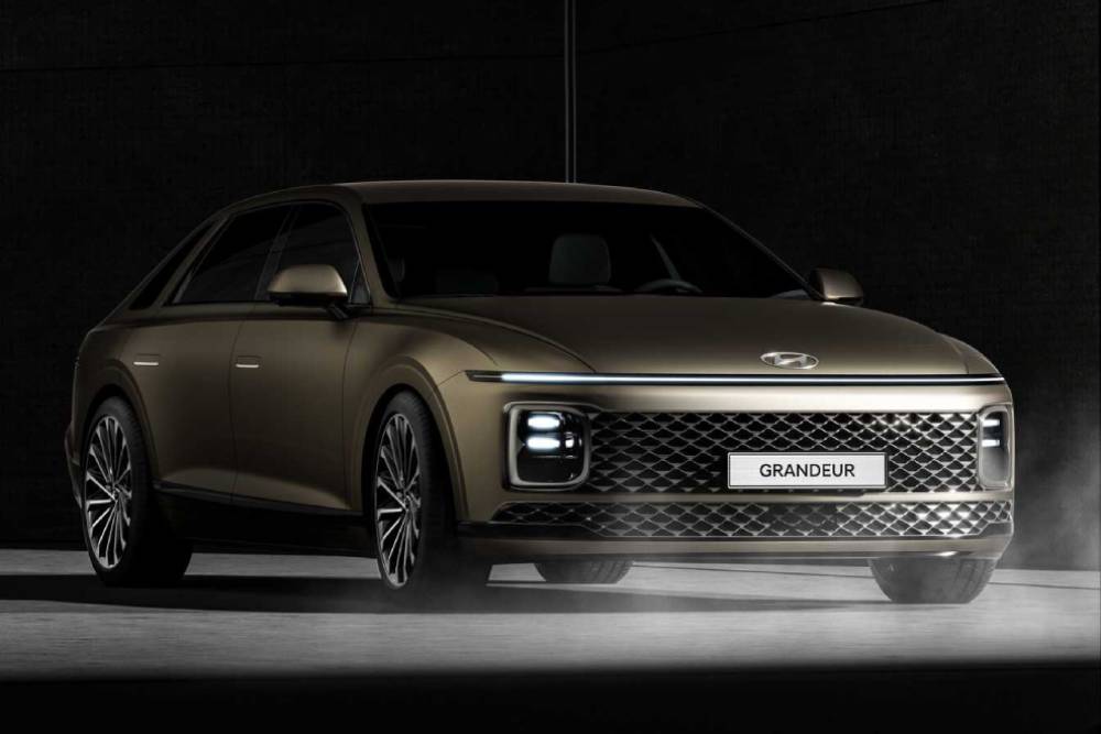 Το Grandeur MK7 παρουσιάζεται ριζικά αλλαγμένο σε σχέση με τον προκάτοχο, ενστερνιζόμενο πολλά στοιχεία από τις φουτουριστικές γραμμές του MPV Staria. Στο εμπρός μέρος κερδίζει όλα τα βλέμματα η ενιαία διαμόρφωση των φωτιστικών σωμάτων, που αποτελούνται από μια λωρίδα LED. Ίδια διαρρύθμιση συναντάμε και στο πίσω μέρος, που δανείζεται το σχήμα από το Ioniq 6 και συνιστά ένα από τα πιο ιδιαίτερα σε καινούργιο αυτοκίνητο. Στον εμπρός προφυλακτήρα κυριαρχεί η κυψελοειδής εισαγωγή, ενώ το προφίλ κυριαρχείται από τις μεγάλες ζάντες (αδιευκρίνιστων διαστάσεων), τις πτυσσόμενες χειρολαβές και την ιδιόμορφη διαμόρφωση τρίτης κολόνας-παραθύρου.