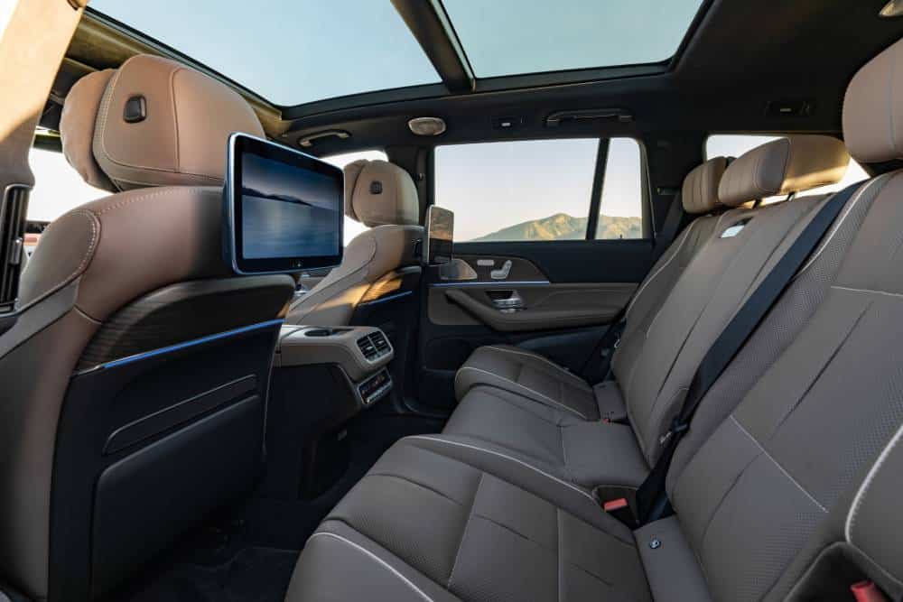 Πέρα από την οθόνη Hyperscreen με τα τρία μόνιτορ των 12,3 ιντσών που καλύπτει όλο το ταμπλό, την παρουσία φωνητικού βοηθού και τεχνητής νοημοσύνης, η GLS προσφέρει το πακέτο Rear Comfort Plus. Όπως λέει το όνομα, πρόκειται για μια επιλογή που μετατρέπει τα πίσω καθίσματα σε χώρο ευεξίας, παρέχοντας οθόνες, μασάζ, θέρμανση/κλιματισμό και ανατομικές ρυθμίσεις για όλους τους επιβάτες, ακόμα και αυτούς στην τρίτη σειρά. Διότι μέσα σε όλα, η GLS είναι και 7θέσια. Οι επιβάτες της μεσαίας σειράς έχουν στην διάθεσή τους 2 οθόνες 11,6 ιντσών, ενσωματωμένες στις πλάτες των εμπρός καθισμάτων, ενώ υπάρχει και Android tablet στο υποβραχιόνιο του μεσαίου καθίσματος για τον έλεγχο του MBUX. Επίσης συναντάμε LED κρυφό φωτισμό, επαγωγικό ασύρματο φορτιστή smartphones, δερμάτινες και ξύλινες επενδύσεις, head-up display και χρήση μπόλικου αλουμινίου.