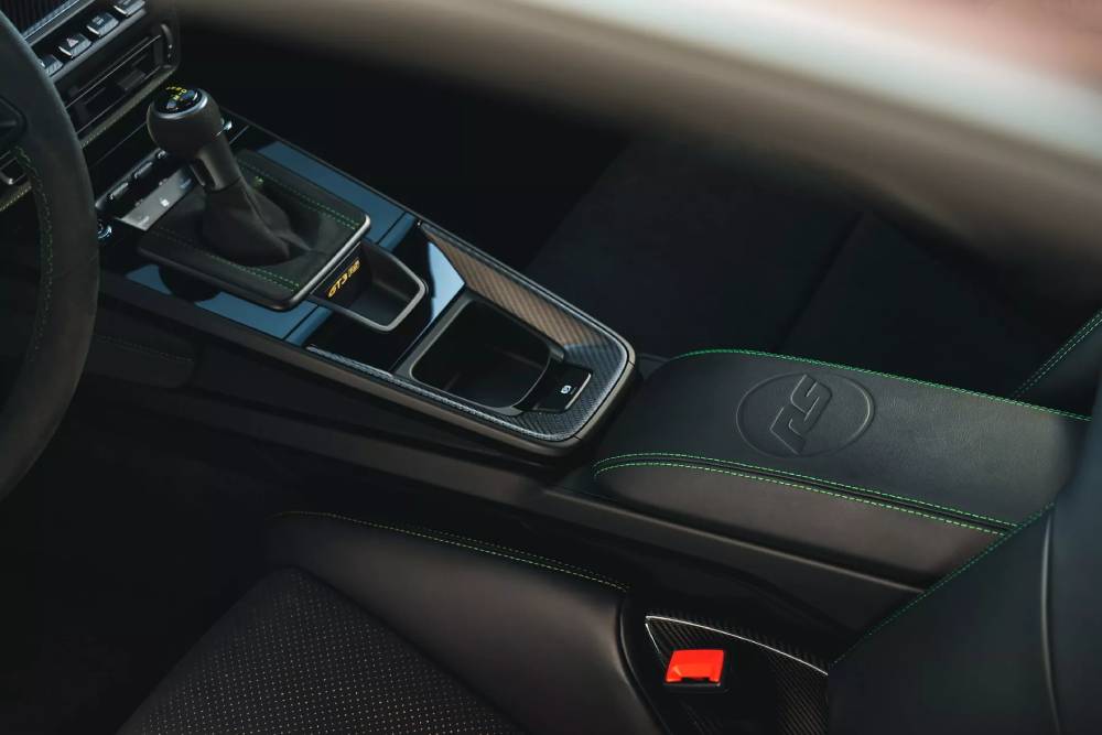 Η «πρασινάδα» διακρίνει και την καμπίνα, μέσω των ραφών σε καθίσματα/υποβραχιόνιο και ταμπλό, αλλά και των κεντημένων λογότυπων στα προσκέφαλα που απεικονίζουν την πίστα δοκιμών της Porsche. Στα μαρσπιέ συναντάμε την επιγραφή της ονομασίας, ως καλωσόρισμα του οδηγού (και του συνοδηγού) στην εκλεκτή αγκάλη της ιδιαίτερης 911 GT3 RS.