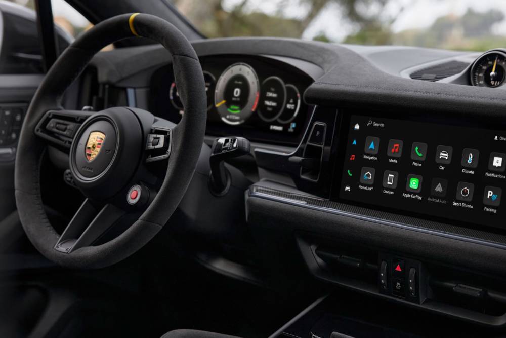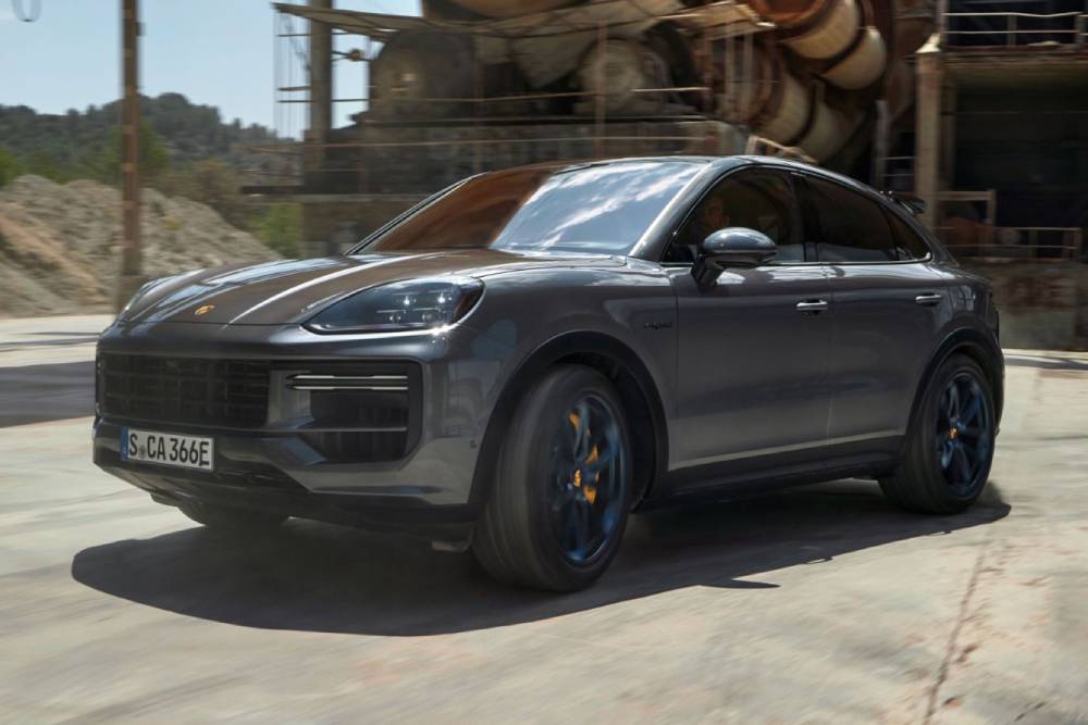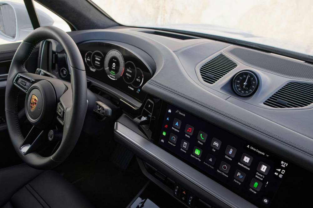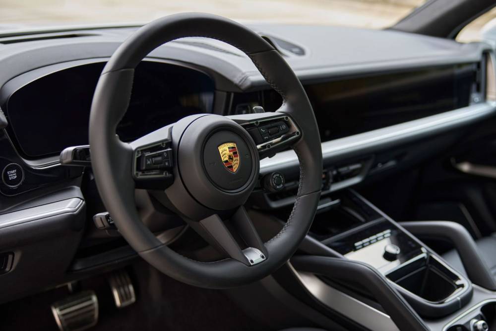 Στο εσωτερικό συναντάμε σπορ τιμόνι και δέρμα παντού, την ώρα που η Coupe βάζει στην εικόνα suede και μπλε πινελιές στις επενδύσεις (το ίδιο ισχύει για τις ζάντες και τις δαγκάνες των φρένων). Ο κυρτός ψηφιακός πίνακας οργάνων των 12,6 ιντσών και η οθόνη αφής των 12,3 ιντσών για το σύστημα πολυμέσων χαρακτηρίζουν το ταμπλό, όπως και ο χρονογράφος στην κορυφή με το πακέτο Chrono Package. Προφανώς δεν τίθεται θέμα πληρότητας εξοπλισμού, οπότε πάμε κατευθείαν στο επουσιώδες της Cayenne Turbo E-Hybrid, που δεν είναι άλλο από το κινητήριο σύνολο.