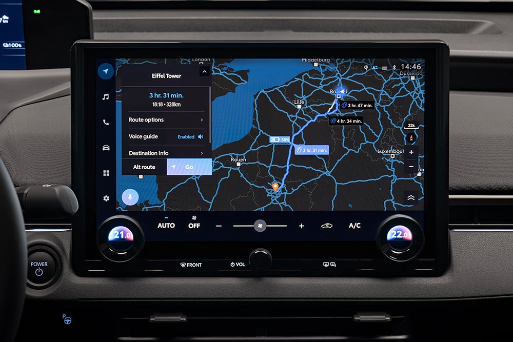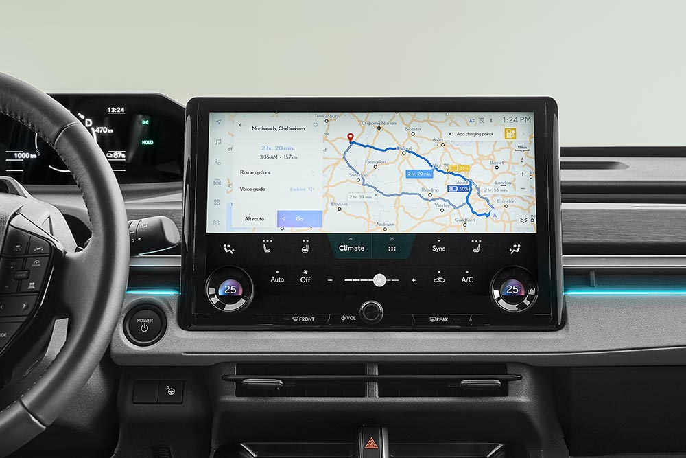 Οι μεγαλύτερες διαστάσεις μεταφράζονται σε γενναιόδωρους χώρους εσωτερικά, όπως φανερώνουν τα 900 χλστ. που χωρίζουν οδηγό-συνοδηγό. Η Toyota υπόσχεται κορυφαίο αέρα τόσο για τα κεφάλια όλων των επιβατών όσο και τα γόνατα των πίσω, ενώ και το πορτμπαγκάζ των 416 λίτρων κρίνεται ως επαρκέστατο για ηλεκτρικό 4,5 μέτρων. Στο ταμπλό δεσπόζει η κεντρική οθόνη αφής για το infotainment, συνοδευόμενη από ένα μικρότερο μόνιτορ για τον ψηφιακό πίνακα οργάνων, ο οποίος τοποθετείται πάνω και πίσω από αυτή ώστε -σύμφωνα με τους Ιάπωνες- το μάτι του οδηγού να μην αποσπάται από τα πολυμέσα, αλλά και να έχει το καντράν πρακτικά στην ίδια ευθεία.