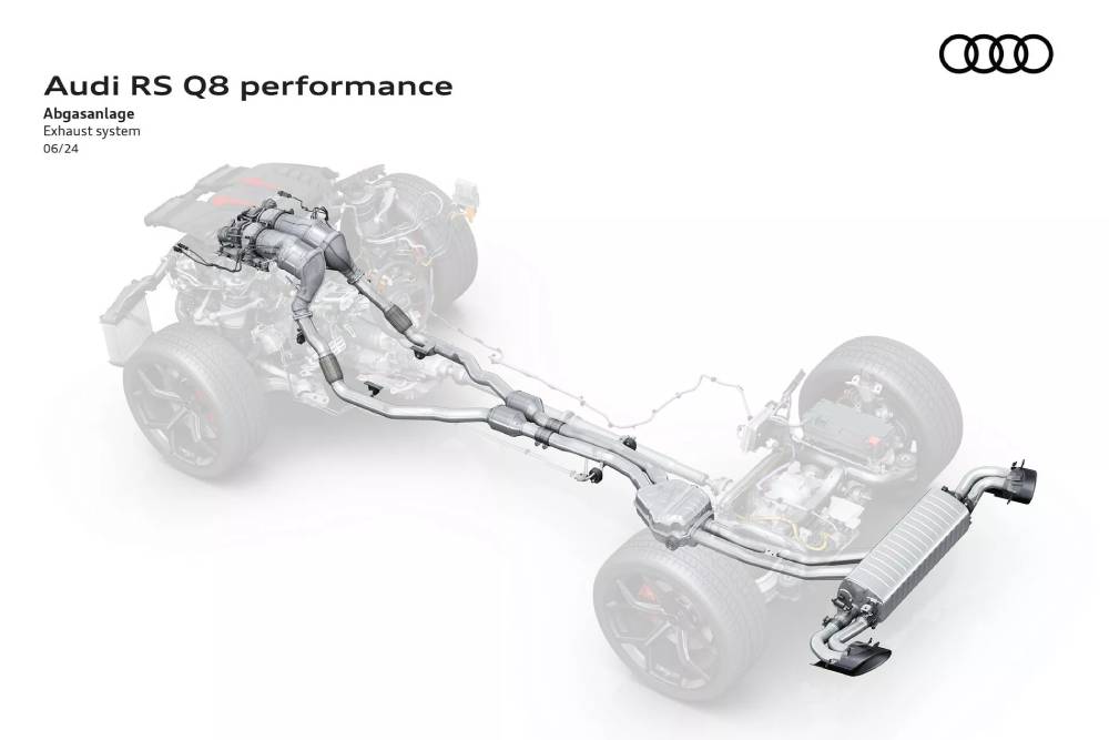 Οι εμφανείς αλλαγές περιλαμβάνουν ό,τι και στο απλό φρεσκαρισμένο Q8, δηλαδή ανασχεδιασμένα φωτιστικά σώματα και LED. Από εκεί και πέρα, το RS Q8 ξεχωρίζει απευθείας μέσω του μαύρου χρώματος σε μάσκα, σήματα, καθρέπτες και 22άρες ζάντες (23άρες στο Performance), μαζί φυσικά με τους διαφορετικούς προφυλακτήρες και τον ευμεγέθη διαχύτη στον πίσω, ο οποίος «αγκαλιάζει» δυο εξίσου χορταστικές μπούκες για την εξάτμιση. Πίσω από τις ζάντες δεσπόζουν τα δισκόφρενα των 420 χλστ. μπροστά με τις 10πίστονες δαγκάνες, ενώ πίσω βρίσκουμε 6πίστονες σε δίσκους 370 χλστ. Το Performance πάει ακόμα παραπέρα με 440 χλστ. εμπρός, ενώ τα 370άρια πίσω εδώ είναι κεραμικής υπόστασης. Προαιρετικά, προσφέρονται carbon και τα μπροστά δισκόφρενα.