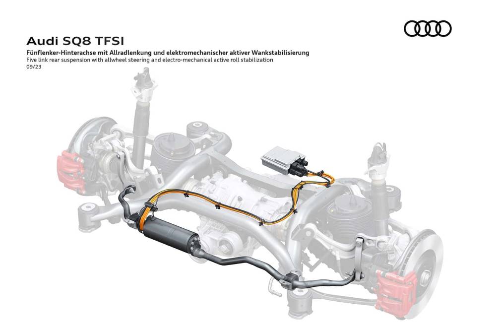 Στις στροφές φροντίζει η ηλεκτρονικά ελεγχόμενη αερανάρτηση, που αυξομειώνει το ύψος του οχήματος κατά 90 χλστ., μαζί με τις ενεργές αντιστρεπτικές που κρατάνε οριζόντιο το θεόρατο αμάξωμα στα πλευρικά φορτία. Για τους πιο απαιτητικούς, η Audi Sport προσφέρει ακόμα πιο σπορ ανάρτηση, σύστημα τετραδιεύθυνσης και ηλεκτρονικά ελεγχόμενα μπλοκέ διαφορικό στον πίσω άξονα.