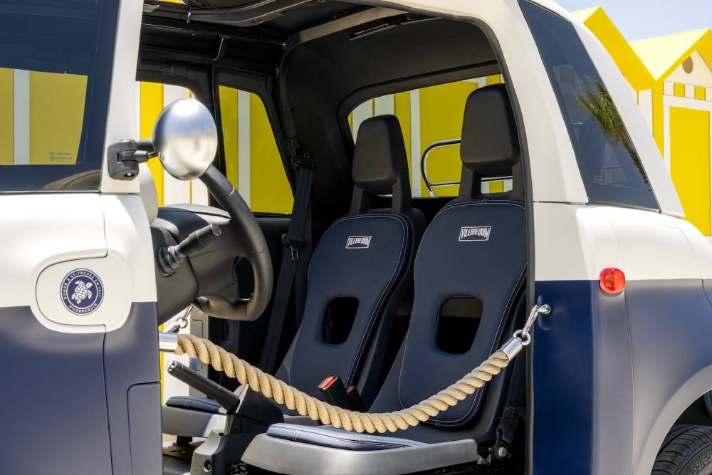 Το νέο Topolino Vilebrequin ξεχωρίζει από τη ναυτική γαλανόλευκη διχρωμία στο αμάξωμα (με ματ Marine Blue βαφή κιόλας), την παρουσία σχοινιών στη θέση των θυρών, την υφασμάτινη αναδιπλούμενη οροφή, τους χρωμιωμένους καθρέπτες, τις επενδύσεις στο εσωτερικό με τη θαλάσσια χελώνα (το σήμα της Vilebrequin) και τα νέα πατάκια, που δεν είναι πατάκια αλλά ταπέτα από τικ εμπνευσμένα από τα γιοτ! Μοναδική, και χρηστικότατη για μετά την παραλία, πινελιά το γεγονός ότι τα σχοινιά στις πόρτες είναι και μικρές ντουζιέρες, που ψεκάζουν νερό για να φεύγουν τα αλάτια και η άμμος μετά το μπάνιο!