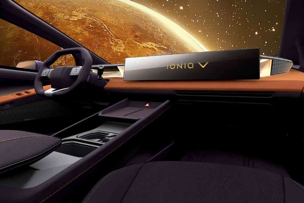 Οι ελάχιστοι πρόβολοι συμβάλλουν τόσο στη σχεδίαση όσο και την εργονομία, η οποία αφορά κανονικότατο σεντάν. Μπορεί το αμάξωμα να φέρνει σε fastback, αλλά το Ioniq V είναι «κούρσα» με τα όλα της, περιλαμβανομένης πόρτας πορτμπαγκάζ που ανοίγει χωριστά από το κρύσταλλο. Όπως θα περίμενε κανείς από ένα αυτοκίνητο που προορίζεται για την Κίνα, το εσωτερικό στερείται των περισσότερων φυσικών χειριστηρίων. Στη θέση τους υπάρχει μια τεράστια οθόνη αφής 27 ιντσών, ανάλυσης 4K, την οποία μπορεί να χρησιμοποιήσει και ο συνοδηγός, καθώς εκτείνεται στη δεξιά πλευρά του ταμπλό. Ο οδηγός δεν διαθέτει ξεχωριστό πίνακα οργάνων, αλλά δεν χρειάζεται κιόλας χάρη στο head-up display. Η καμπίνα είναι και κορυφαία σε διαστάσεις, εκτός από τεχνολογία, με 1.078 χλστ. χώρο για τα πόδια οδηγού-συνοδηγού και 1.019 χλστ. χώρο για τα πόδια στους πίσω επιβάτες, που συμπληρώνονται από τον καλύτερο χώρο για τους ώμους στην κατηγορία τους (1.502 χλστ. μπροστά / 1.473 χλστ. πίσω).