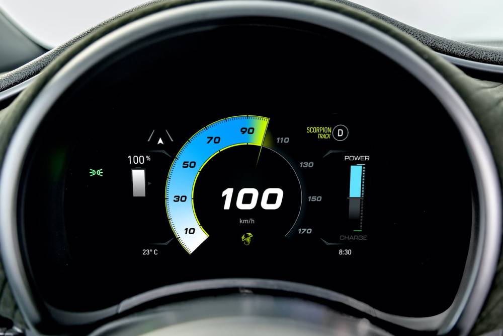 O οδηγός έχει στη διάθεσή του 3 προγράμματα λειτουργίας (Turismo, Scorpion Street, Scorpion Track), με το πρώτο να περιορίζει την ισχύ στα 135 άλογα και τα 220 Nm για περισσότερη αυτονομία (η οποία δεν ανακοινώνεται). Στα Scorpion Street/Track ηλεκτροκινητήρας και ανάκτηση ενέργειας δουλεύουν στο φουλ, επιτρέποντας την οδήγηση μόνο με το πεντάλ του γκαζιού. Τέλος, το Sound Generator εμπλουτίζει τους ήχους που συνοδεύουν την κίνηση του αυτοκινήτου (για να γίνεται αντιληπτό από τους πεζούς) με κανονικές χροιές από τον 1.400άρη τούρμπο των θερμικών Abarth!