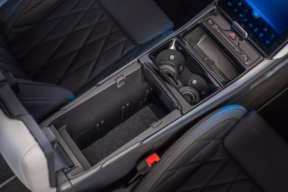 Στο εσωτερικό συναντάμε μια φαντασμαγορική κάθετη οθόνη αφής 14,6 ιντσών Ford Sync Move, που αλλάζει κλίση εμπρός-πίσω έως 30 μοίρες, με αρκετές παραπομπές σε εκείνη της Mustang Mach-E. Εδώ έχει μεγαλύτερη κλίση και πλαισιώνεται από τους αεραγωγούς του κλιματισμού, ενώ πάνω από αυτούς διακρίνουμε τον ambient φωτισμό. Ο ψηφιακός πίνακας οργάνων των 5 ιντσών δεν θα μπορούσε να λείπει, με το τιμόνι να είναι παραλληλόγραμμο και επίπεδο τόσο στο κάτω, όσο και το πάνω μέρος. Η χωροταξία αποτέλεσε προτεραιότητα για τους σχεδιαστές, εξασφαλίζοντας έναν τεράστιο χώρο 17 λίτρων κάτω από το υποβραχιόνιο (MegaConsole) ικανό να φιλοξενήσει μέχρι laptop! Στο ίδιο κλίμα τα 470 λίτρα του πορτμπαγκάζ, που ξεπερνά τα 1.400 λίτρα χωρητικότητας με τα πίσω καθίσματα αναδιπλωμένα.