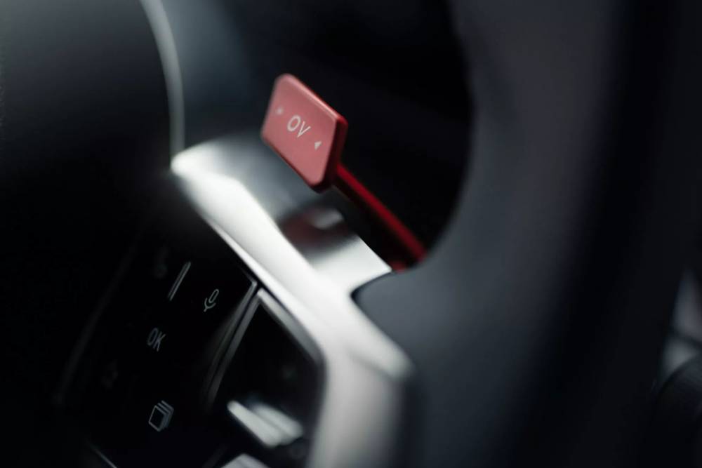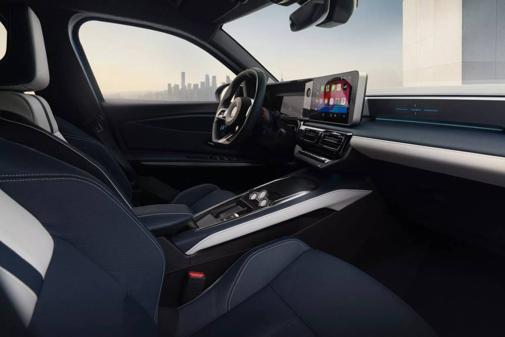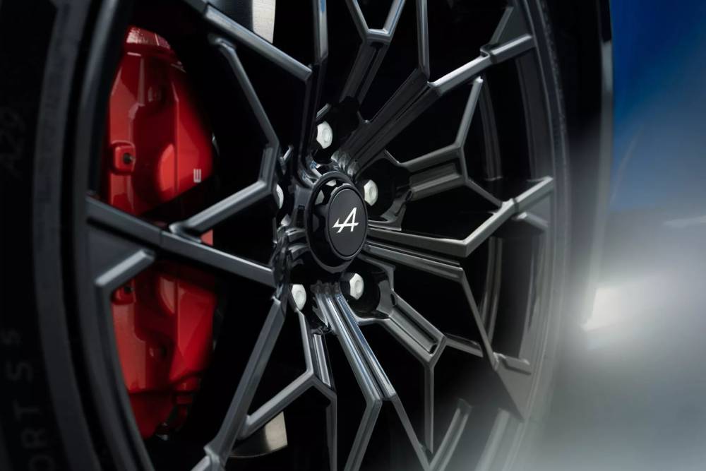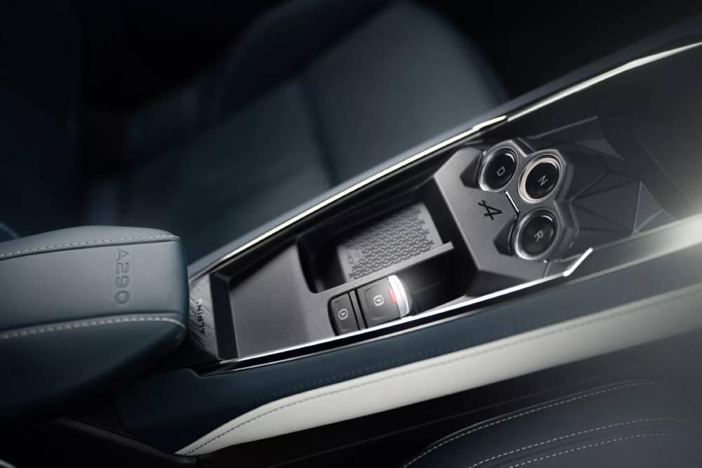 Στο εσωτερικό κυριαρχούν τα δερμάτινα μπάκετ καθίσματα και οι πινελιές γαλάζιου χρώματος, ενώ εντυπωσιακή σε όψη (λογικά και σε υφή) είναι η παχιά στεφάνη του flat bottomed τιμονιού. Το κόκκινο κουμπί για το overboost πίσω από αυτή, αλλά και τα γραφικά στην ενιαία οθόνη επίσης αποτελούν αποκλειστικά προνόμια του μικρότερου μοντέλου στη γκάμα της Alpine.