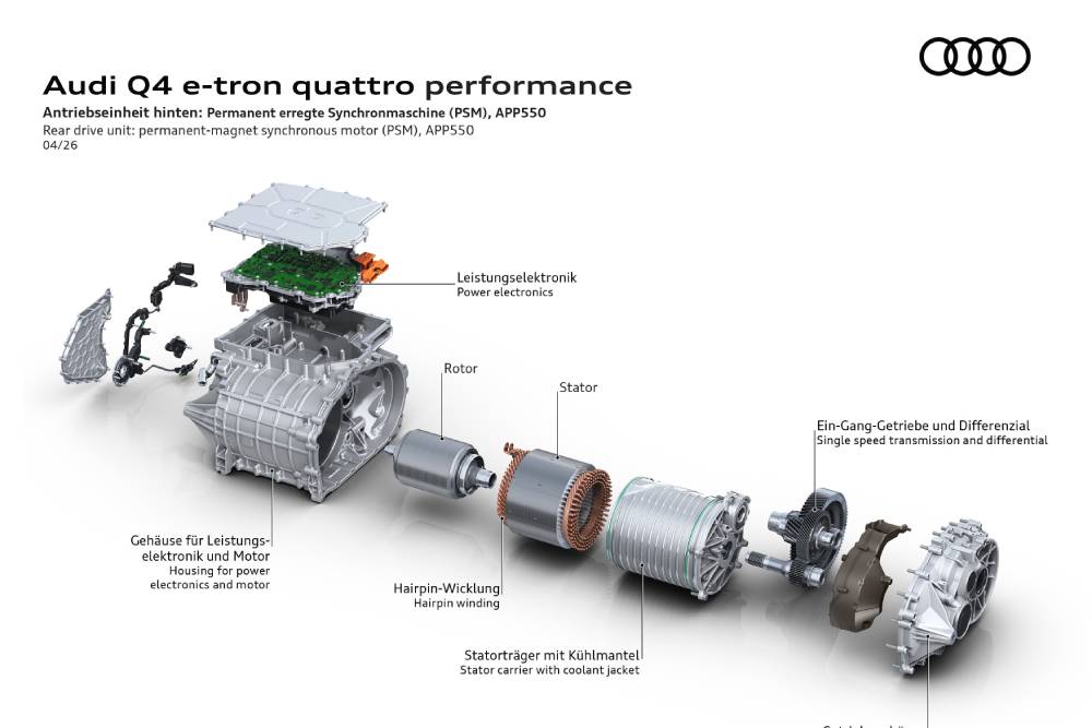 Όλες οι εκδόσεις του Audi Q4 e-tron, είτε με κίνηση στους πίσω τροχούς είτε με τετρακίνηση quattro, διαθέτουν σύγχρονο ηλεκτροκινητήρα μόνιμου μαγνήτη στον πίσω άξονα, σε δύο εκδόσεις ισχύος. Ο νέος ηλεκτροκινητήρας APP350 ενσωματώνει σειρά βελτιώσεων που αυξάνουν την αποδοτικότητα και τη ροπή. Η αναβάθμιση του ηλεκτροκινητήρα συνοδεύεται από νέα ηλεκτρονικά ισχύος. Ο παλμικός αντιστροφέας χρησιμοποιεί ημιαγωγούς καρβιδίου του πυριτίου, οι οποίοι μειώνουν τις απώλειες μεταγωγής και βελτιώνουν την απόδοση, ιδιαίτερα σε συνθήκες μερικού φορτίου. Νέες λειτουργίες λογισμικού συμβάλλουν επίσης στη βελτιστοποίηση της κατανάλωσης. Συνολικά, η αποδοτικότητα έχει βελτιωθεί κατά περίπου 10% σε σύγκριση με το προηγούμενο μοντέλο.