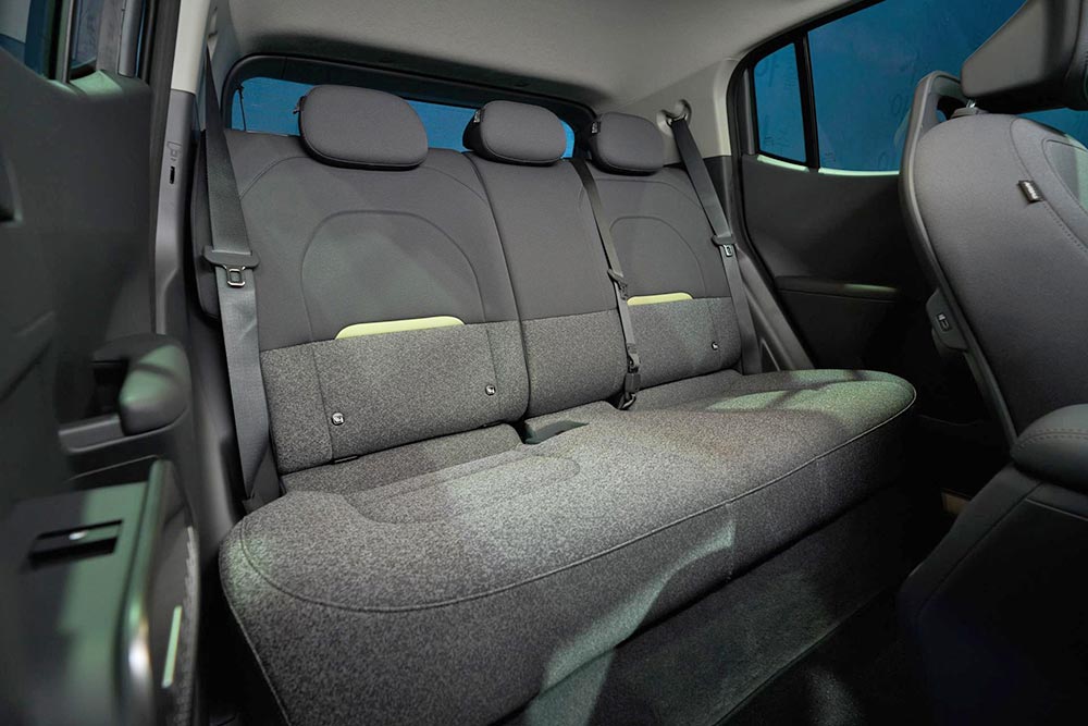 Ένα περιμετρικό προστατευτικό ενσωματώνει άψογα την πανοραμική ευρεία οθόνη — συνδυάζοντας έναν πίνακα οργάνων 12,3 ιντσών, μια οθόνη 5 ιντσών για τον κλιματισμό και ένα infotainment 12,3 ιντσών — ενώ τα οριζόντια σχεδιαστικά στοιχεία ενισχύουν το οπτικό πλάτος. Υλικά πλούσια σε ύφασμα ενισχύουν την άνεση και προσθέτουν ζεστασιά, την ώρα που ο ατμοσφαιρικός φωτισμός εκτείνεται σε όλη την καμπίνα και συγχρονίζεται με τα φλας για να παρέχει σιγουριά και διαισθητική υποστήριξη στον οδηγό. Ένα νέο σύστημα συρόμενων και ανακλινόμενων πίσω καθισμάτων μεγιστοποιεί την καθημερινή χρηστικότητα. Ο χώρος για τα πόδια των πίσω επιβατών εκτείνεται από 885 χλστ. σε 958 χλστ, τιμή κορυφαίο στην κατηγορία του. Όταν τα καθίσματα σύρονται πλήρως προς τα εμπρός, το EV2 προσφέρει χώρο αποσκευών έως και 403 λίτρα, έχοντας ένα επίσης κορυφαίο frunk 15 λίτρων να τον πλαισιώνει.