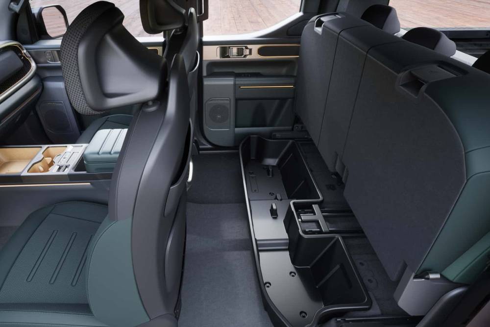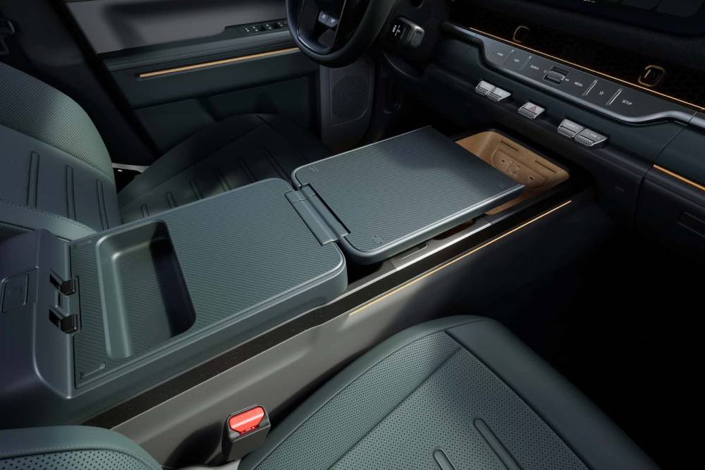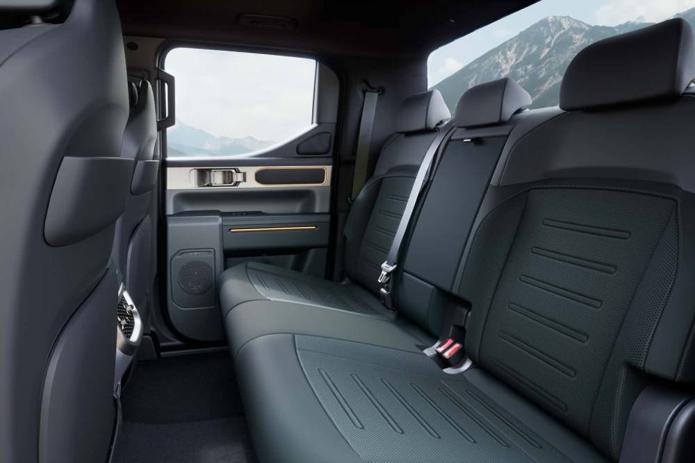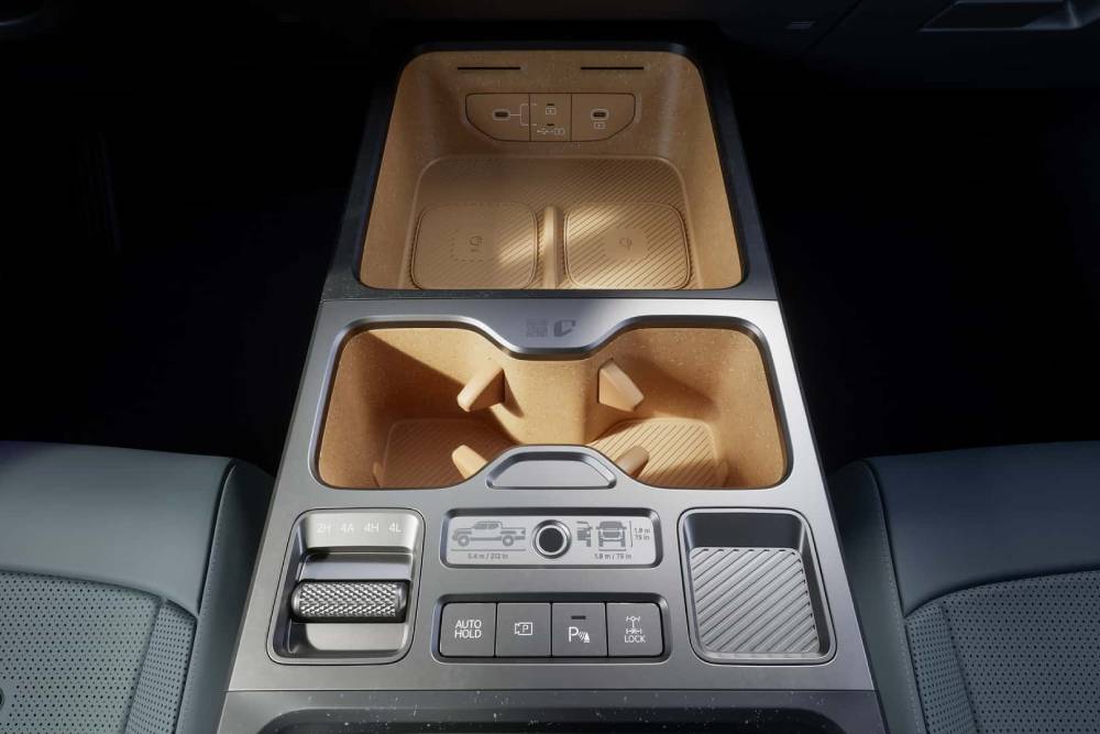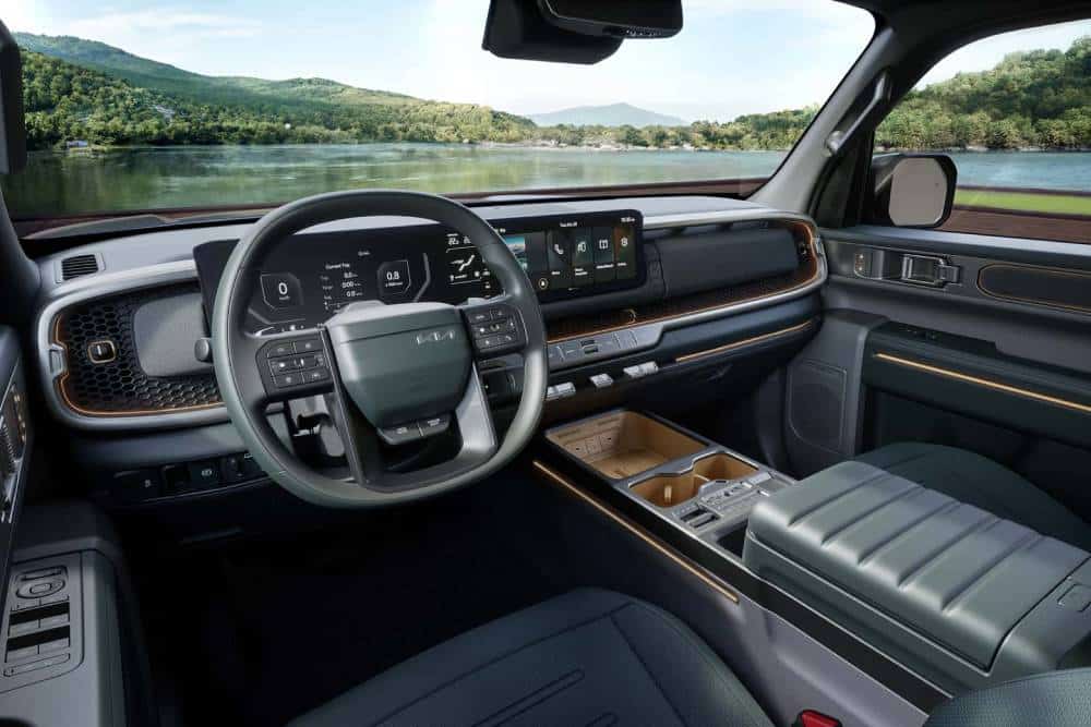 Μέσα, πάντως, ελάχιστα θυμίζει pick up το Tasman. Η ενιαία διάταξη των οθονών (12,3 ίντσες ο ψηφιακός πίνακας οργάνων, άλλες 12,3 ίντσες το infotainment και μια μικρή 5 ιντσών ανάμεσά τους) δεσπόζει στην κορυφή του ταμπλό, όπως και οι ευθείες γραμμές. Η φαρδιά κεντρική κονσόλα κρύβει 33 λίτρα αποθηκευτικού χώρου, την ώρα που οι πίσω επιβάτες απολαμβάνουν 940 χλστ. «αέρα» για τα γόνατα. Η Kia αναφέρει πως το Tasman παίρνει την πρωτιά στην κατηγορία τόσο στο χώρο για τα γόνατα των πίσω, όσο και τις αντίστοιχες μετρήσεις για κεφάλι και ώμους. Ρόλο παίζει εδώ και η ρυθμιζόμενη κλίση της πλάτης των πίσω καθισμάτων, από 22 ως 30 μοίρες. Φυσικά, σε ένα ολοκαίνουργιο αυτοκίνητο, δεν λείπουν τα ανακυκλωμένα/ανακυκλούμενα υλικά στην καμπίνα.