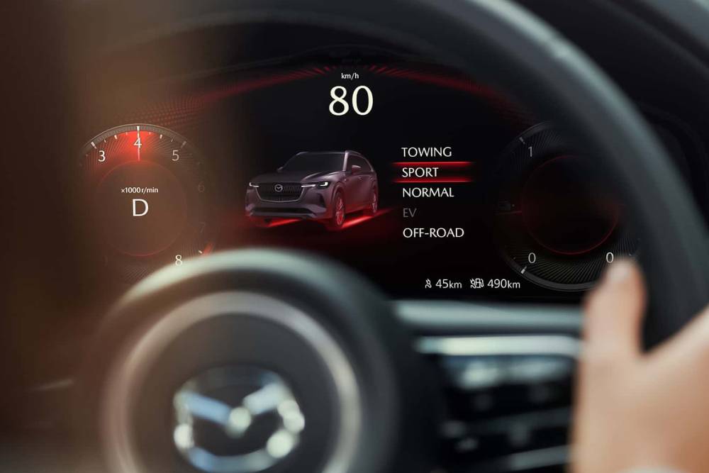 Από το CX-60 προέρχεται αυτούσια η γκάμα των κινητήρων, η οποία ανοίγει με τον ήπια υβριδικό ντίζελ 3.3λτ. εξακύλινδρο εν σειρά twinturbo των 254 ίππων και 550 Nm. Το CX-90 δεν συνδυάζεται με την βασική έκδοση των 200 ίππων και 500 Nm, επιταχύνοντας στα 100 χλμ./ώρα από στάση εντός 8,4 δλ. και μέχρι τα 219 χλμ./ώρα. Εναλλακτικά υπάρχει η κορυφαία PHEV εκδοχή, αποτελούμενο από έναν τετρακύλινδρο βενζινοκινητήρα Skyactiv-G 2.5 λτ. άμεσου ψεκασμού και έναν μεγάλο ηλεκτροκινητήρα 136 PS, που συνεργάζεται με αυτόματο κιβώτιο 8 σχέσεων (όπως και στο ντίζελ) και μια μπαταρία υψηλής χωρητικότητας 355 V, 17,8 kWh. Αυτός ο συνδυασμός αποδίδει συνολική ισχύς συστήματος 327 ίππους και 500 Nm. Εδώ το 0-100 χλμ./ώρα είναι ζήτημα μόλις 6,8 δλ., ενώ η τελική περιορίζεται ηλεκτρονικά στα 195 χλμ./ώρα.
