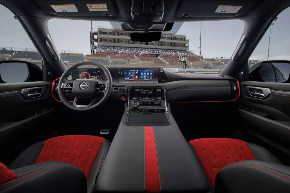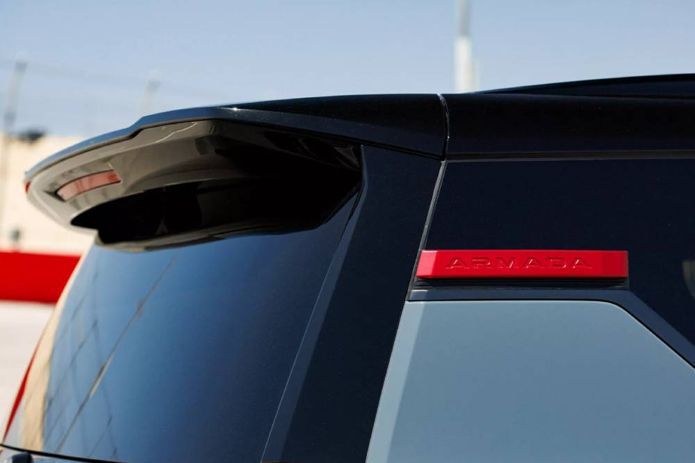 Οι διαφορές με το απλό Armada δεν χρειάζονται πάνω από μισή ματιά για να φανούν. Καταρχάς, το χαρακτηριστικό Stealth Grey χρώμα (προσφέρεται και το Black Diamond Pearl) που γνωρίσαμε από το GT-R, σε συνδυασμό με κόκκινες λεπτομέρειες στη μάσκα, το splitter, τις πλαϊνές ποδιές, το διαχύτη, τις πίσω κολώνες και τους καθρέπτες. Οι gloss black ενθέσεις δεν γινόταν να λείπουν από τα προαναφερθέντα σημεία, προαιρετικά την οροφή και στάνταρ τις 22άρες ζάντες, που πίσω τους κρύβουν κόκκινες 4πίστονες δαγκάνες για τα φρένα. Η απόσταση μεταξύ φτερού και τροχού έχει μειωθεί χάρη στα ελατήρια χαμηλώματος, ενισχύοντας τόσο την εμφάνιση όσο και το στήσιμο.