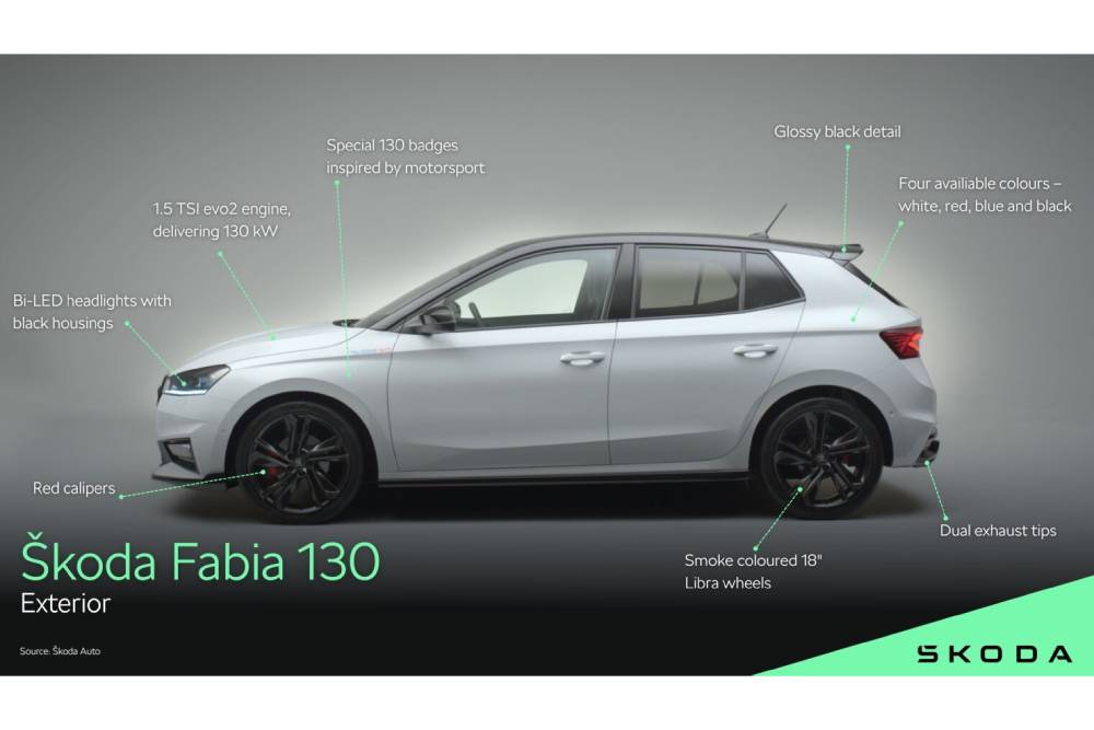 To Fabia 130, βασισμένo στην έκδοση εξοπλισμού Monte Carlo, διατίθεται σε τέσσερα χρώματα – λευκό, κόκκινο, μπλε και μαύρο, που συμπληρώνονται από μαύρες κολόνες και οροφή. Το εξωτερικό περιλαμβάνει γυαλιστερές μαύρες λεπτομέρειες όπως το splitter μπροστά, η αεροτομή και ο διαχύτης, ενώ τα σήματα «130» απαντώνται στα εμπρός φτερά και την πόρτα του πορτμπαγκάζ. Οι προβολείς Bi-LED έχουν φιμέ βάση και οι αποκλειστικές ζάντες Libra των 18 ιντσών σε συνδυασμό με τη χαμηλωμένη ανάρτηση (-15 χλστ.), ενισχύουν τη δυναμική εμφάνιση του αυτοκινήτου, όπως και η μαύρη λωρίδα στο πίσω μέρος, που παραπέμπει στο αγωνιστικό Fabia Rally2.