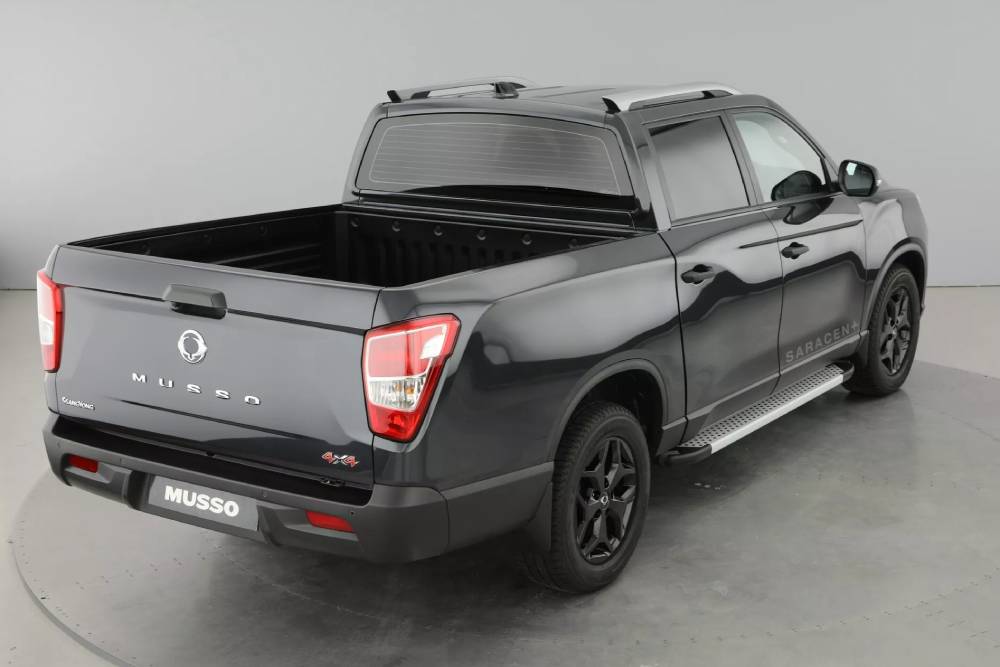 Η γκάμα του Musso μόλις φρεσκαρίστηκε στην αγορά της Μεγάλης Βρετανίας, από όπου ξεχωρίζουν οι δυο κορυφαίες εκδόσεις Saracen και Saracen+. Αμφότερες ξεχωρίζουν από τις μαύρες 18άρες ζάντες, τα σκαλοπάτια στα μαρσπιέ, τα LED ημέρας και τα σχετικά αυτοκόλλητα στις εμπρός πόρτες, ενώ εσωτερικά συναντάμε δερμάτινες επενδύσεις Nappa, αυτόματο διζωνικό κλιματισμό, θερμαινόμενα καθίσματα και για τους πίσω επιβάτες, cruise control και σύστημα πολυμέσων με οθόνη αφής 9,2 ιντσών. Πλουσιοπάροχος εξοπλισμός, ο οποίος στην περίπτωση του Saracen+ συνοδεύεται από αντίστοιχη «άπλα» στο χώρο φόρτωσης.