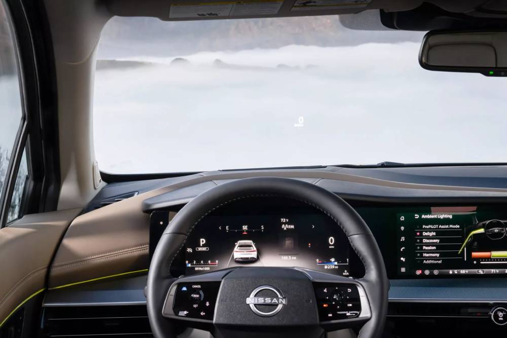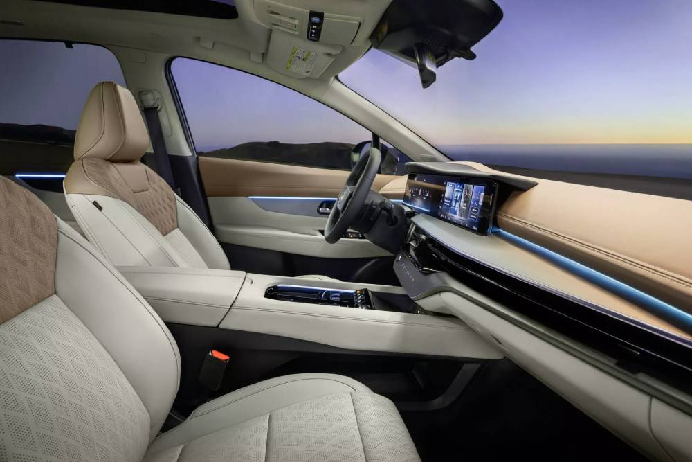 Οι επιρροές Ariya επεκτείνονται στο εσωτερικό, με το δίδυμο των οθονών (12,3 ίντσες έκαστη) να καταλαμβάνουν το πάνω, αλλά και το μεγαλύτερο, μέρος του ταμπλό. Ο ambient φωτισμός, το δυάκτινο τιμόνι και τα αναβαθμισμένα υλικά κεντρίζουν τα βλέμματα, ενώ εξοπλιστικά τα πάντα είναι στάνταρ: όλα τα συστήματα υποβοήθησης του οδηγού, Apple CarPlay, Android Auto, ηχοσύστημα της Bose και προαιρετικά, μέχρι δερμάτινα καθίσματα με λειτουργία μασάζ.