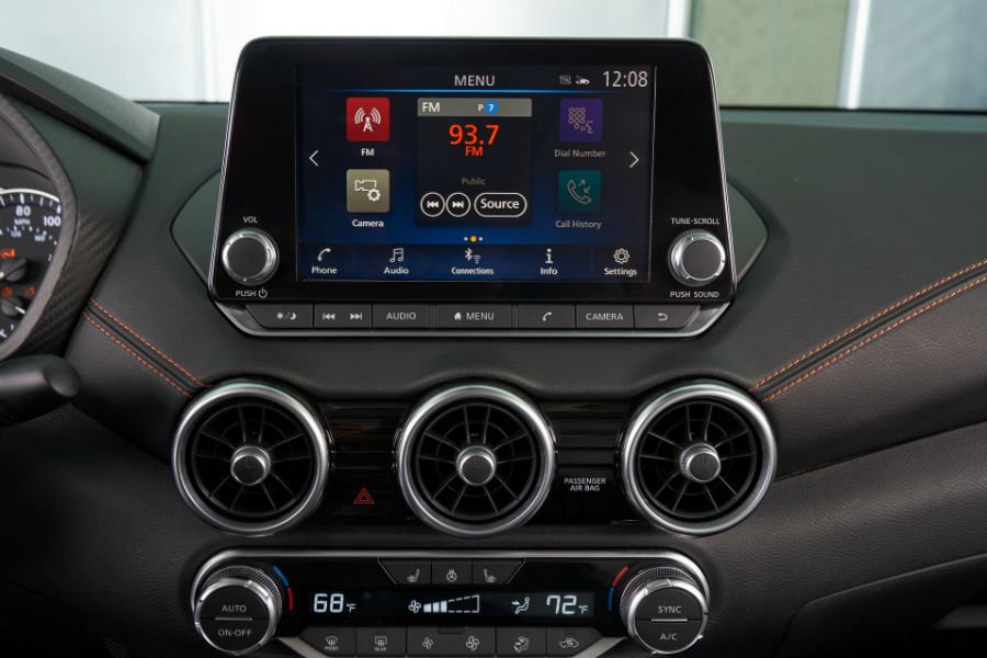 Στο εσωτερικό ξεχωρίζουν οι 3 κυκλικοί αεραγωγοί στην κεντρική κονσόλα, μαζί με την οθόνη αφής των 8 ιντσών και τον ψηφιακό πίνακα οργάνων των 4,2 ιντσών. Όλες οι λειτουργίες συνδεσιμότητας (Apple CarPlay και Android Auto) είναι παρούσες, από κοινού με το πακέτο συστημάτων ασφαλείας Safety Shield 360 της Nissan.