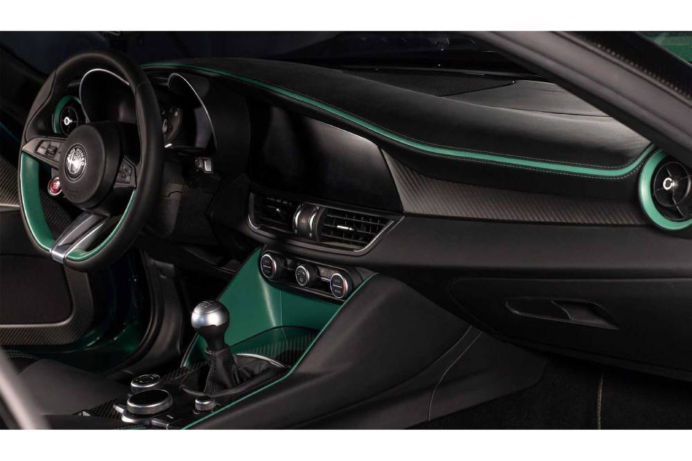 Το εσωτερικό δεν ακολουθεί το δραματικό παρουσιαστικό του -πλήρως ανθρακονημάτινου- αμαξώματος, ξεχωρίζοντας μόνο από τον νέο πίνακα οργάνων, τα πρόσθετα φιλέτα carbon και τις πράσινες πινελιές σε ραφές, κεντρική κονσόλα και αεραγωγούς, που μεταφέρουν τη Montreal Green απόχρωση του εξωτερικού στην καμπίνα. Η μείωση του μεταξονίου και η διαφορετική διαμόρφωση της οροφής οδήγησε στην αφαίρεση των πίσω καθισμάτων, καθιστώντας την Giulia Zagato εκτός από δίθυρη και διθέσια. Πρωταγωνιστής, βέβαια, δεν είναι άλλος από τον χορταστικό αλουμινένιο επιλογέα του 6τάχυτου χειροκίνητου κιβωτίου, που φροντίζει για τη σύνδεση του πίσω άξονα με το μηχανοστάσιο.