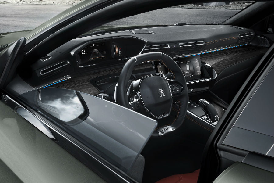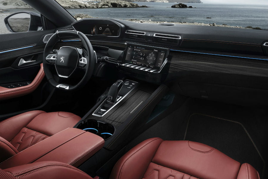 Στο εσωτερικό συναντάμε την εδραιωμένη τεχνοτροπία του i-Cockpit, που εκφράζεται μέσα από ένα μικρό σε διάμετρο (και τετραγωνισμένο) τιμόνι, πάνω -και όχι μέσα- από το οποίο ο οδηγός βλέπει τις ενδείξεις του πίνακα οργάνων σε μια οθόνη 12,3 ιντσών. Άλλη μία οθόνη 10 ιντσών στο κέντρο του ταμπλό, εμφανίζει πληροφορίες για την λειτουργία του κλιματισμού, του τρισδιάστατου συστήματος πλοήγησης και των πολυμέσων. Επίσης, στάνταρ είναι οι υπηρεσίες Apple CarPlay, Android Auto και Peugeot Mirrorlink.