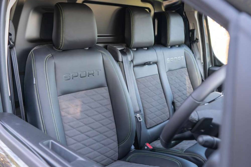 Στο εσωτερικό συναντάμε δερμάτινα μπάκετ καθίσματα για οδηγό-συνοδηγό, με λαχανί ραφές και κεντημένο το «Sport» στις πλάτες. Το ενδιάμεσο δεν είναι μπάκετ, ούτε φέρει το Sport, αλλά συμμετέχει στο δερμάτινο και ανοιχτό πράσινο μοτίβο. To σύστημα πολυμέσων με οθόνη αφής 10 ιντσών είναι στάνταρ, όπως και ο ψηφιακός πίνακας οργάνων, την ώρα που ο εξοπλισμός περιλαμβάνει από σύστημα πλοήγησης και κάμερα οπισθοπορείας, μέχρι ψηφιακό βοηθό «OK Peugeot» με φωνητική ενεργοποίηση. Επαναλαμβάνουμε, για να μην ξεχνιόμαστε, σε επαγγελματικό όχημα όλα αυτά.