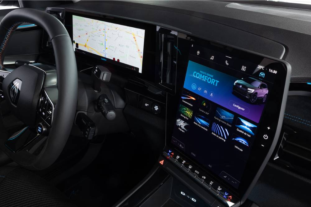 Ακόμα πιο εντυπωσιακή είναι η εικόνα που λάβαμε από το εσωτερικό του Austral. Κυρίαρχο στοιχείο αποτελεί η οθόνη OpenR που εμφανίστηκε στο νέο Megane E-Tech και είναι από τις μεγαλύτερες του είδους. Καλύπτεται από γυαλί Gorilla-Glass, έτσι ώστε να είναι ανθεκτική σε γρατσουνιές, μικροχτυπήματα. αλλά και στον καθαρισμό. Επιπλέον, φέρει πρόσθετες καλύψεις κατά των δακτυλικών αποτυπωμάτων και αντιθαμβωτικές στρώσεις. Αποτελείται από τον παραμετροποιήσιμο πίνακα οργάνων των 12,3 ιντσών και την κεντρική οθόνη των 12 ιντσών (9,3 ιντσών η βασική). Αμφότερες οι οθόνες παρέχουν πληθώρα πληροφοριών, έχουν σύγχρονα γραφικά και η απόκρισή τους στις εντολές του οδηγού είναι γρήγορη.