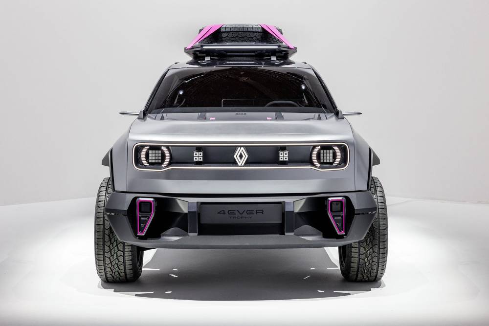 Πολύ ενδιαφέροντα χαρακτηριστικά συνιστούν οι μεγάλοι αεραγωγοί του καπό, που σύμφωνα με τη Renault βελτιώνουν την απόδοση του ψυγείου, οι φουτουριστικές ζάντες των 19 ιντσών (σε μικτά λάστιχα 255/55), τα πλαστικά προστατευτικά πέριξ του αμαξώματος και η σχάρα οροφής, που αποτελείται από ανθρακονήματα και φιλοξενεί τη ρεζέρβα, λωρίδα LED, φτυάρι και σανίδες πρόσφυσης. Το 4EVER Trophy είναι βαμμένο σε Gun Metal Silver χρώμα και απέχει 200 χλστ. από το έδαφος, έχοντας παράλληλα πλήρως προστατευμένο πάτωμα με έξτρα ελάσματα για την απομόνωση της μπαταρίας.