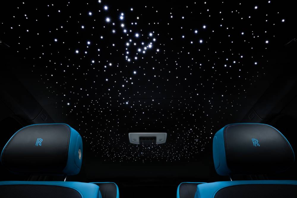 Το σήμα Spirit of Ecstasy, η μάσκα και οι 21άρες ζάντες επίσης φέρουν σκουρόχρωμο φινίρισμα, με τους τροχούς να αποτελούνται από 44 στρώσεις ανθρακονημάτων! Στο εσωτερικό η εικόνα αλλάζει άρδην, καθώς κυριαρχεί το ανοιχτό γαλάζιο χρώμα (ίδιο ακριβώς με τις δαγκάνες των φρένων).