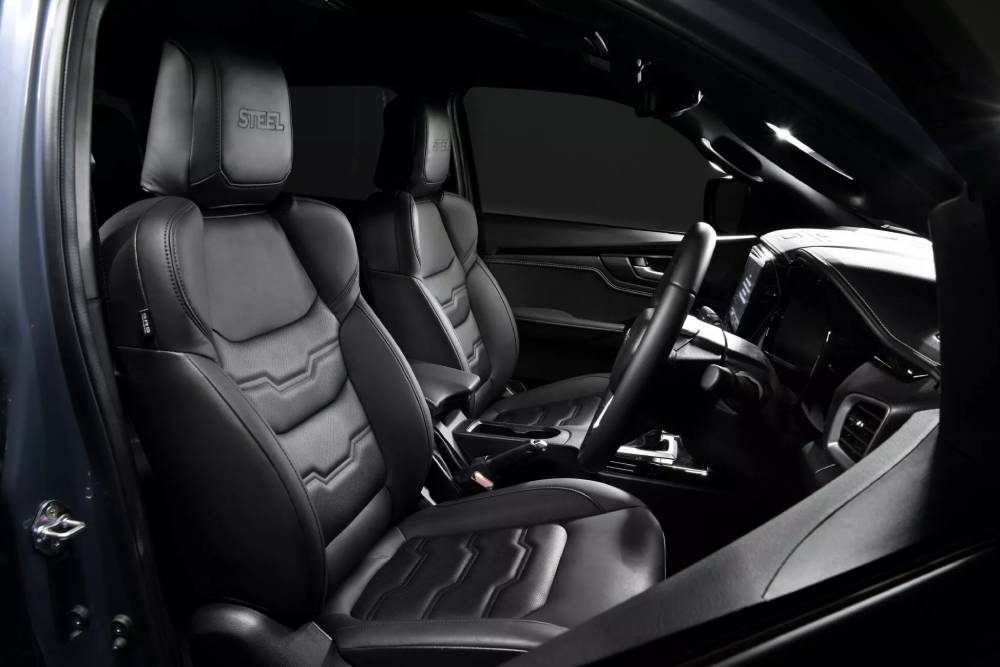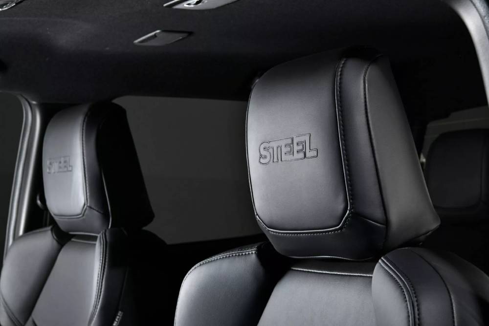 Το D-Max Steel διακρίνεται για το αποκλειστικό Steel Grey Mica χρώμα του, που συνοδεύεται από πινελιές μαύρου χρώματος σε μάσκα, καθρέπτες, ράγες οροφής, προστατευτικά θόλων, σκαλοπάτια και 18άρες ζάντες. Κατάμαυρο είναι και το «Isuzu», που δεσπόζει στο εμπρός μέρος, ενώ το ανάλογο σήμα στην πόρτα της καρότσας προσδιορίζει το ποιόν της έκδοσης. Φυσικά, αυτό που το κάνει καλύτερα από όλα είναι τα αυτοκόλλητα στις πόρτες. Στο εσωτερικό συνεχίζουν οι σκοτεινές αποχρώσεις, με τα δέρματα να καλύπτουν τις περισσότερες επιφάνειες και τα κεντητά «Steel» στα προσκέφαλα να κλέβουν τις εντυπώσεις, όπως και τα νέα μαρσπιέ.