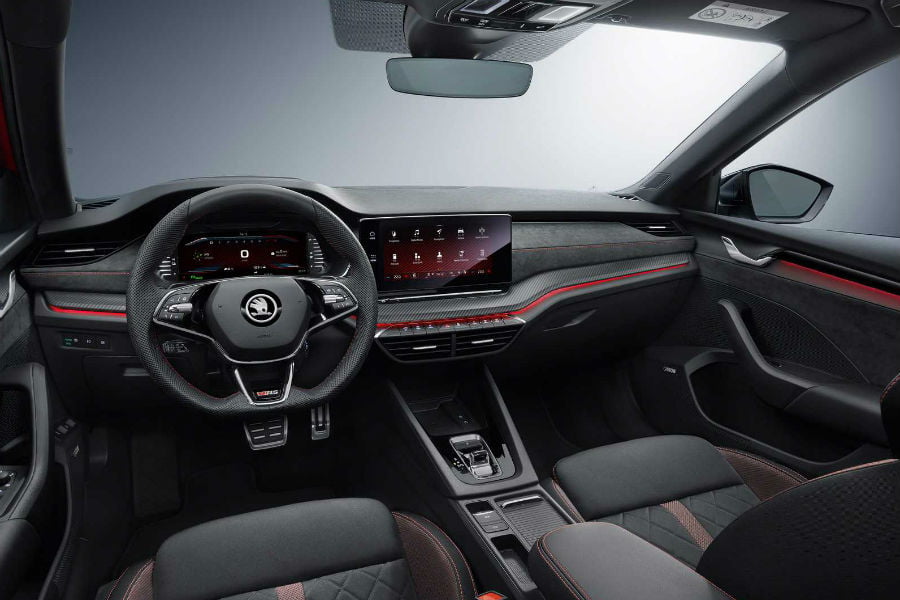 Στο εσωτερικό το δερμάτινο τιμόνι, τα μπάκετ καθίσματα με ραμμένα τα σήματα «vRS», η κόκκινη λωρίδα που διατρέχει ταμπλό και πόρτες, τα αλουμινένια πεντάλ και οι επενδύσεις alcantara ξεκαθαρίζουν σε οδηγό και επιβάτες πως βρίσκονται σε σπορ αυτοκίνητο.